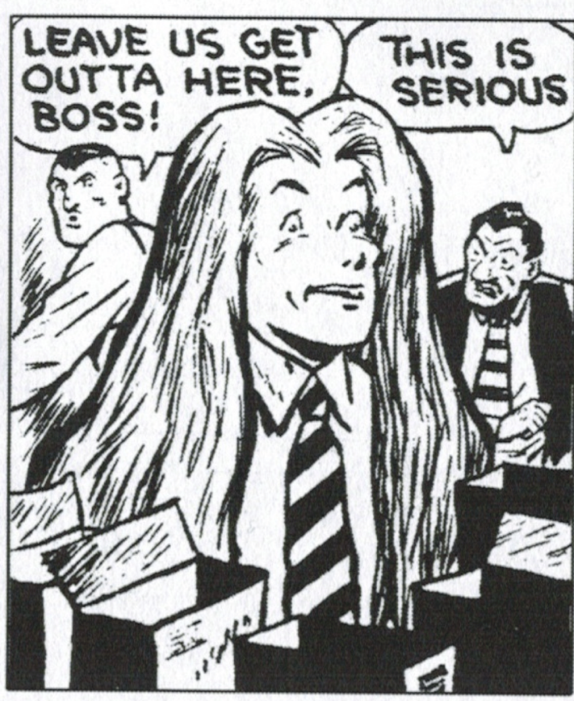 But Elmo was a singular creation that seemed on the surface an Al Capp Li’l Abner knock-off. A rube from the sticks comes to the city and seems to use his half-wit to outwit a cast of broadly drawn types (corporate CEO “Commodore Bluster”, femme fatale and stripper Sultry Lebair, political boss Mr. Hoodlum). Even the visual style feels like a less talented Capp – thick inking, wild hand and body postures, short and sparse blobby lines to craft facial caricatures.