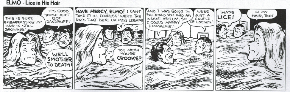 But the plotlines venture further off the rails and more deeply into dark areas of the American soul than Capp ever imagined. In just the first few months I have already read, Elmo saves a rich tycoon from suicide, is rewarded with controlling interest in a cereal company, is hypnotized into thinking he is a skunk, who he lives amongst at the zoo, is kidnapped by Mr. Hoodlum, and force fed breakfast cereal, which grows so much hair on his head it drowns his kidnappers in his tresses.