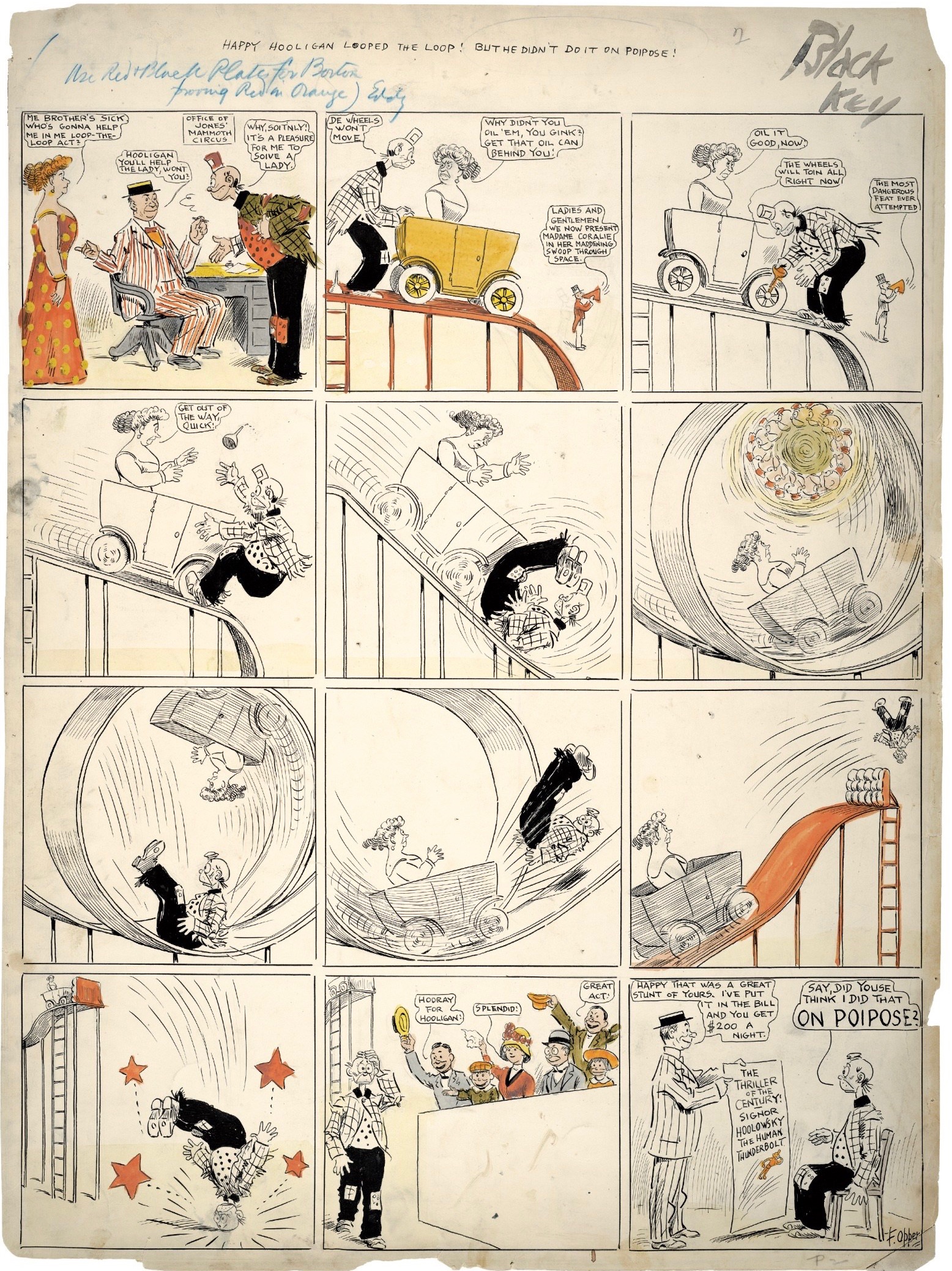 “Happy Hooligan Looped the Loop: But He Didn’t Do It On Poipose!” (July 25, 1909) has been reprinted at least twice and for good reason. It best exemplifies Opper’s talent for containing and ordering chaotic motion with lyric, mechanical beauty. As always, Hap’s misfortune begins with a good deed, assisting a circus performer’s “Hoop Act.” As she descends the track in her roller coaster car, he is toppled and set into motion.