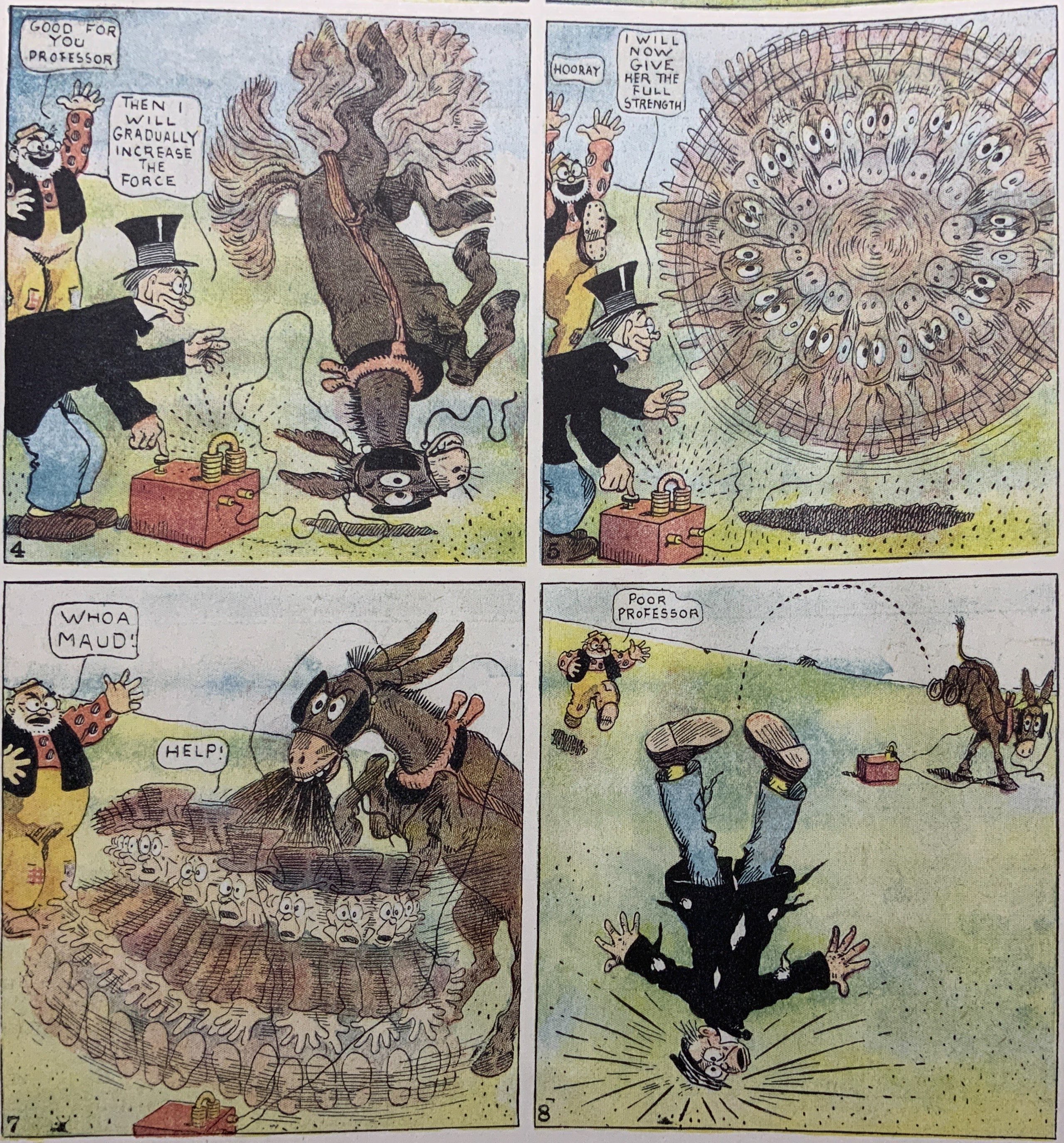 America was in motion, and the first decades of the comic strip were shaped by that culture and in turn interpreted it. Frederick Burr Opper was the chief poet of motion. When his signature characters Happy Hooligan and Maude the Mule did their blurred spin (with multiple iterations of a pie-eyed, panicked visage) he gave us an enduring visual trope. This was frantic motion expressed in a contained, comic, vital way.