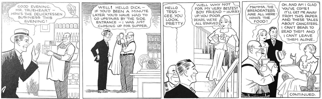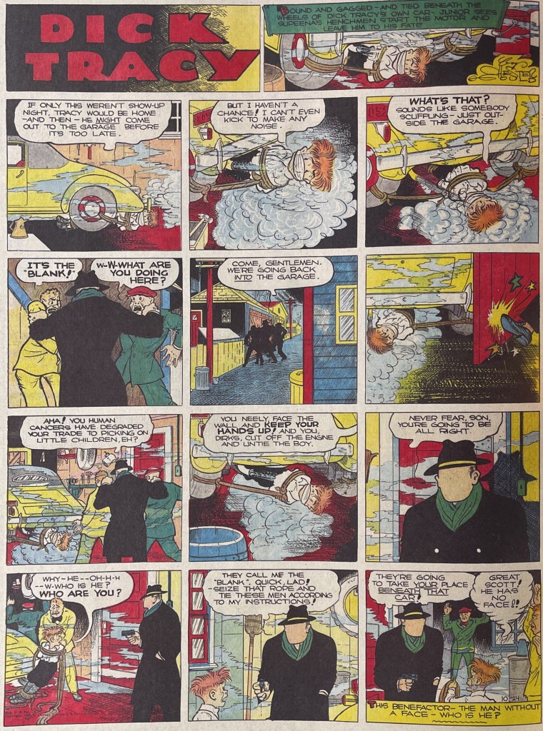 The kid trio centered on Mush Stebbins, Fatso Dolan and Pat Chan represented and interesting multicultural group situated in the new city-suburban setting. It was a direct copy of Gene Byrnes Reg’lar Fellers, which focused on a gang of kids who like much of America migrated outside of urban centers during these post-war years but retained their inner city dialect. These strips were capturing a cultural moment, the growth of city suburbs in the first half of the 20th Century. The migration of city-kid toughness and ethnic diversity to the more sprawling neighborhoods of standalone homes, parks and relative affluence was one of the signal social trends of the modern era and helped reshape ideas of childhood. Interestingly and uniquely, the Pat Chan member of the gang is stereotyped in cartoonish Chinese garb but given a voice that is pure city street.