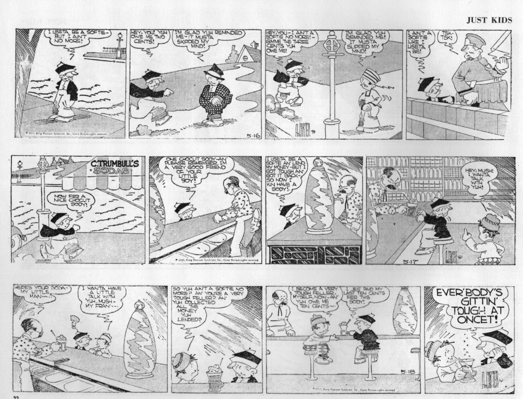 Not quite as adult-like and philosophical as Peanuts, the Just Kids gang had sparks of disarming maturity and complex feeling, insight and woe. One strip ends with the trio sitting on a log surrounded by inflated exclamation marks, Mush saying, “Let’s just sit here and worry.” In the next strip his mother asks him what he seems so worried about and he replies in a voice that clearly foreshadows Charlie Brown himself by more than a decade, “I guess I’m jes’ worried about LIFE IN GENERAL!”