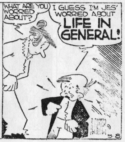 Not quite as adult-like and philosophical as Peanuts, the Just Kids gang had sparks of disarming maturity and complex feeling, insight and woe. One strip ends with the trio sitting on a log surrounded by inflated exclamation marks, Mush saying, “Let’s just sit here and worry.” In the next strip his mother asks him what he seems so worried about and he replies in a voice that clearly foreshadows Charlie Brown himself by more than a decade, “I guess I’m jes’ worried about LIFE IN GENERAL!”