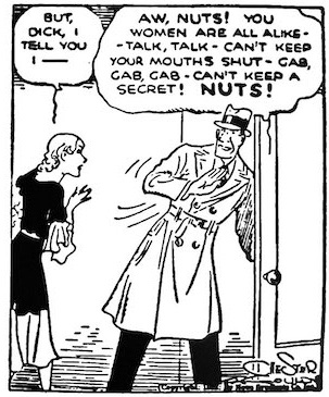 And so it should come as no surprise that from the start Tracy was not exactly a feminist treat. This early passage from the first year of Tracy around 1932 finds Dick being a real dick – mistakenly accusing his fiancé Tess Trueheart of ruining a planned raid on a gangster boss meeting by leaking the plan to friends. It’s a good example of Tracy as buffoon.