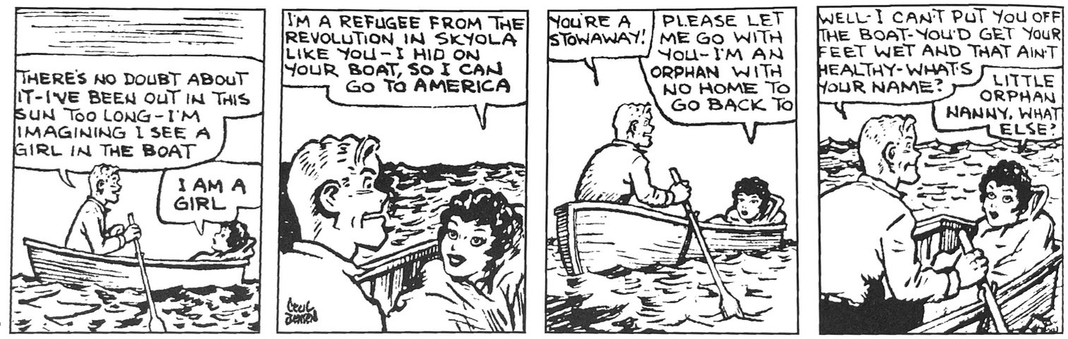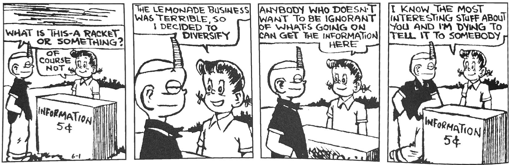 Willard had a deft sense of comic strip cadence, with a great ability to advance an episode yet tell a complete story in just three or four daily frames. In the sequence above, part of a 1931 road trip to Florida, Emmy is trying to get Lord Plushbottom’s attention. The usual sit-com tropes ensue: miscommunication, misapprehension, confusion. Premise, activation and gag all take place within three panels.