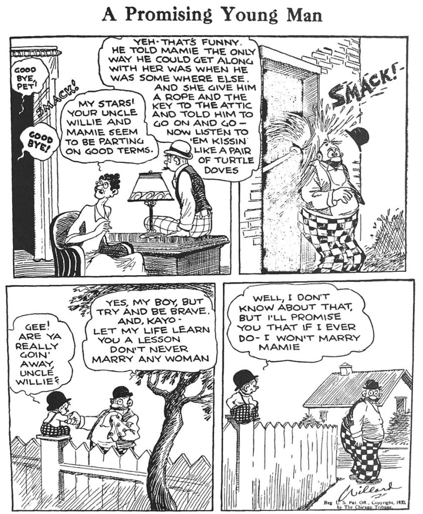 It was Willard’s great comic sense that gave him license to portray an unsentimental vision of marginalized America in ways that were uncommon to the hapless but good-hearted domesticity across the rest of the comics page let alone the idealizations of American life in the rest of popular culture. More on this in the next post.