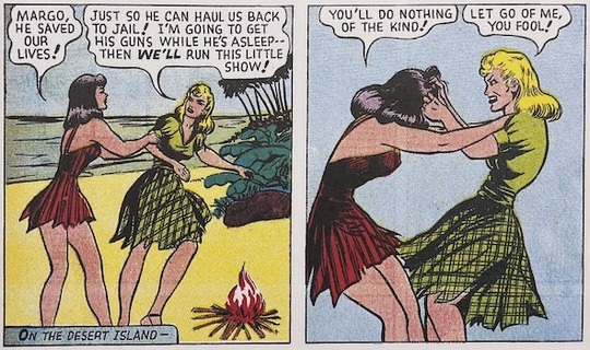 But let the images speak for themselves. Or try to. I am not sure if Moore was using assistants for the Sunday work, but the style here is wildly uneven, usually wooden and with none of the Raymondesque brushwork and framing we see in the dailies. What we do get is a cornucopia of pubescent fantasy. The legs are long and plentiful, and somehow they manage to walk on sandy shores in stilettos. And the fetishes just keep coming: hair-dragging, cat-fighting, even spanking.
