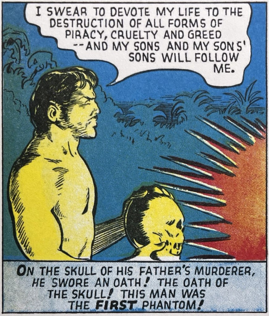 The Phantom is a special case. Sex is baked into the premise and origin story. This is an extravagant revenge fantasy, reaching back 400 years, in which a nobleman swears to avenge the murder of his father at sea by the hands of “Singh pirates.” He dedicates the son of every future generation of his family to fighting piracy of every kind. And so the “the ghost that walks” takes on the mythos of immortality. Of course, the subtext of the origin story is that each generation of Phantom needs a willing wife.