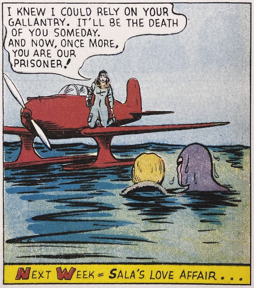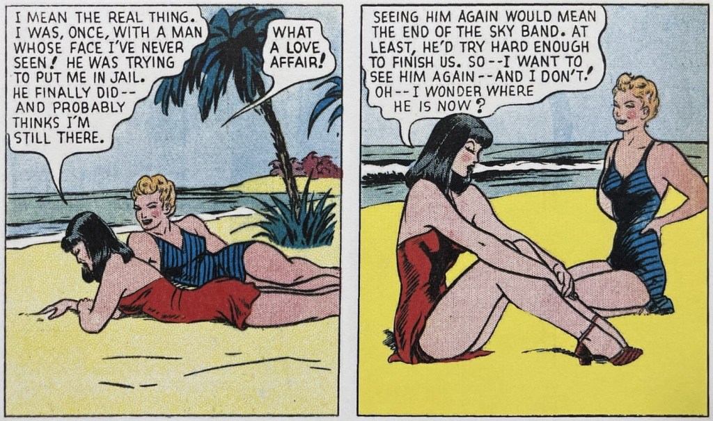 Of course the sultry villainess falling for the sexually irresistible hero was a common trope of mid-century male adventure, and it certainly was familiar to comic strip readers. The theme was central to many of Milt Caniff’s Terry and the Pirates, and Will Eisner’s The Spirit, whose heroes had tortured relationships with a range of recurring femmes fatale. But in Caniff’s much more masterful hands, these plot twists often became opportunities for some remarkable psychologizing. Eisner used the convention as sites for clever banter, inuendo and the Spirit’s comic cummupance at the hands of famously jealous girlfriend Ellen Dolan.