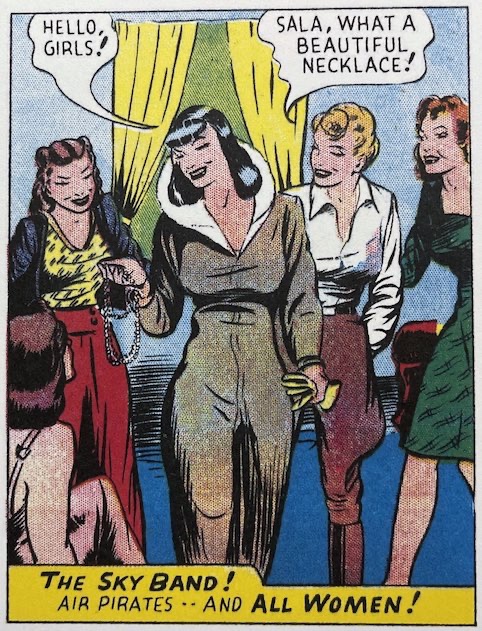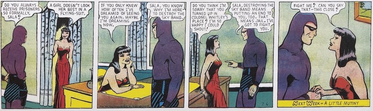 When The Phantom launched a weekly Sunday storyline in 1939, Falk revisited the Sky Band of female pirates he introduced in the dailies earlier. Led by Scala and assisted by Margo, the Band has all of the sexual elements we need: The Phantom repeatedly captured, bound, beaten and saved from certain death by besotted women pirates; villainesses falling and then competing for our hero; female deception, seduction, conniving, etc.