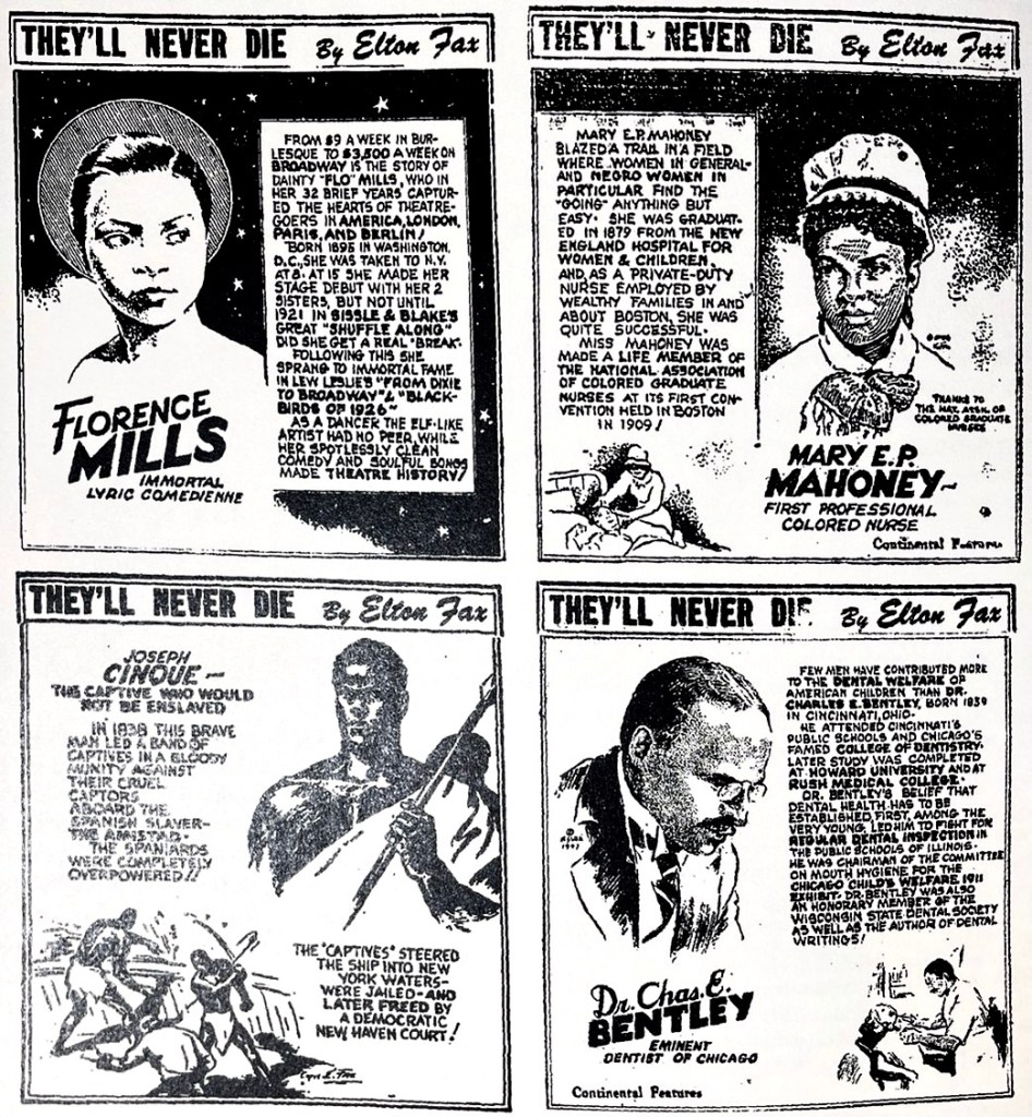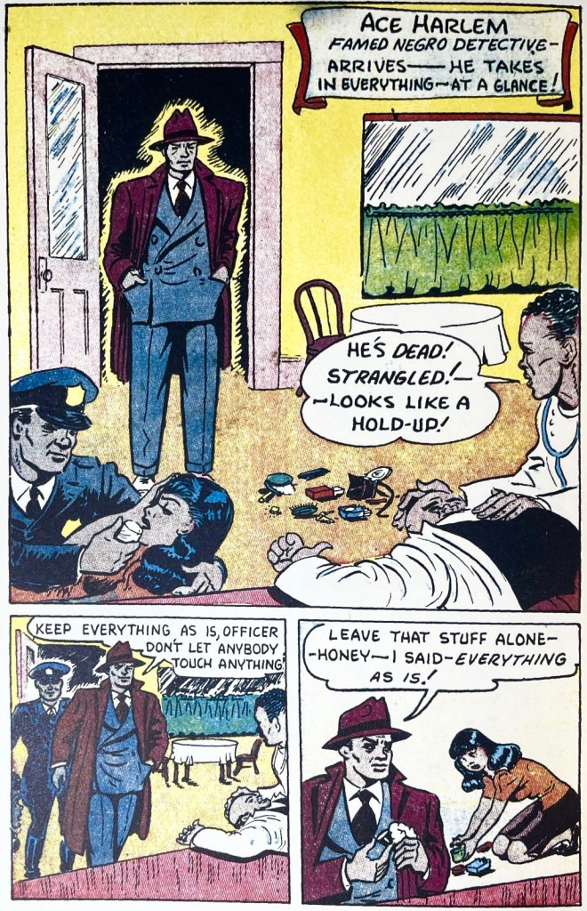 In each of these biographies I found their supporting and prior careers much more interesting, as does the author. Quattro cautions that he is not a formal historian, but he ably sketches in a blind spot for comic strip history – the Black newspaper, as well as the vagaries of freelancing for early comic book and pulp magazine companies and how it allowed many of these “invisible men” sustained careers. In taking a biographical approach to this cast, Quattro defies generalization about these artists’ perspectives and backgrounds. We enter a range of highly individual contexts, especially Black middle-class enclaves in cities like Oberlin, Charleston, Baltimore and more. We get glimpses of how Black newspapers, communities, artist groups lent support and connections for many of these men as they cobbled together artistic careers that moved across Black newspaper comics and editorial, community pamphlets, posters and fine art exhibits in addition to the burgeoning comic book industry.