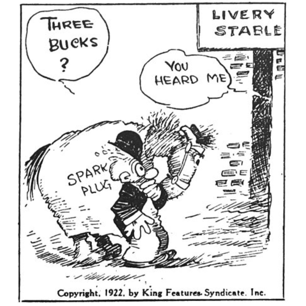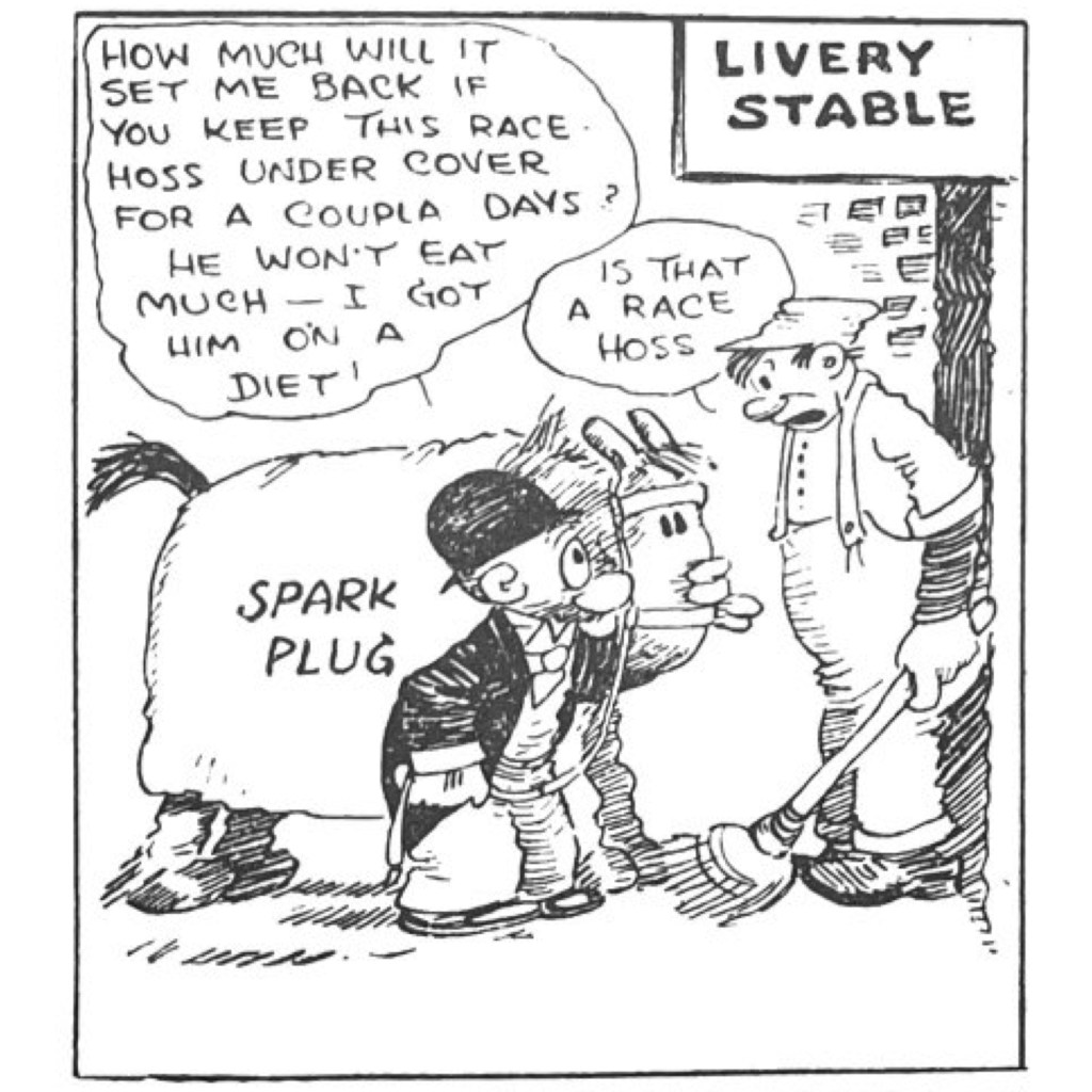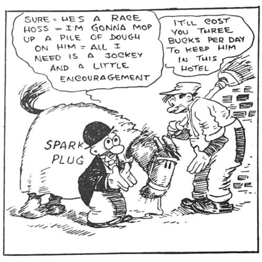 But the real heart of Barney Google comes out when he connects with Spark Plug, the horse that would win and lose countless races over the next decade. See above the first strip in 1922 introducing Sparky. In many ways, the horse replaced Barney’s wife as his love-hate interest. Barney raged whenever his nag lost a race but never could bring himself to stay mad for long. There was real romance here. It is not surprising that Spark Plug became a merchandising hit in the 1920s. One later comics historian compared the nag to Snoopy in the level of his fame.