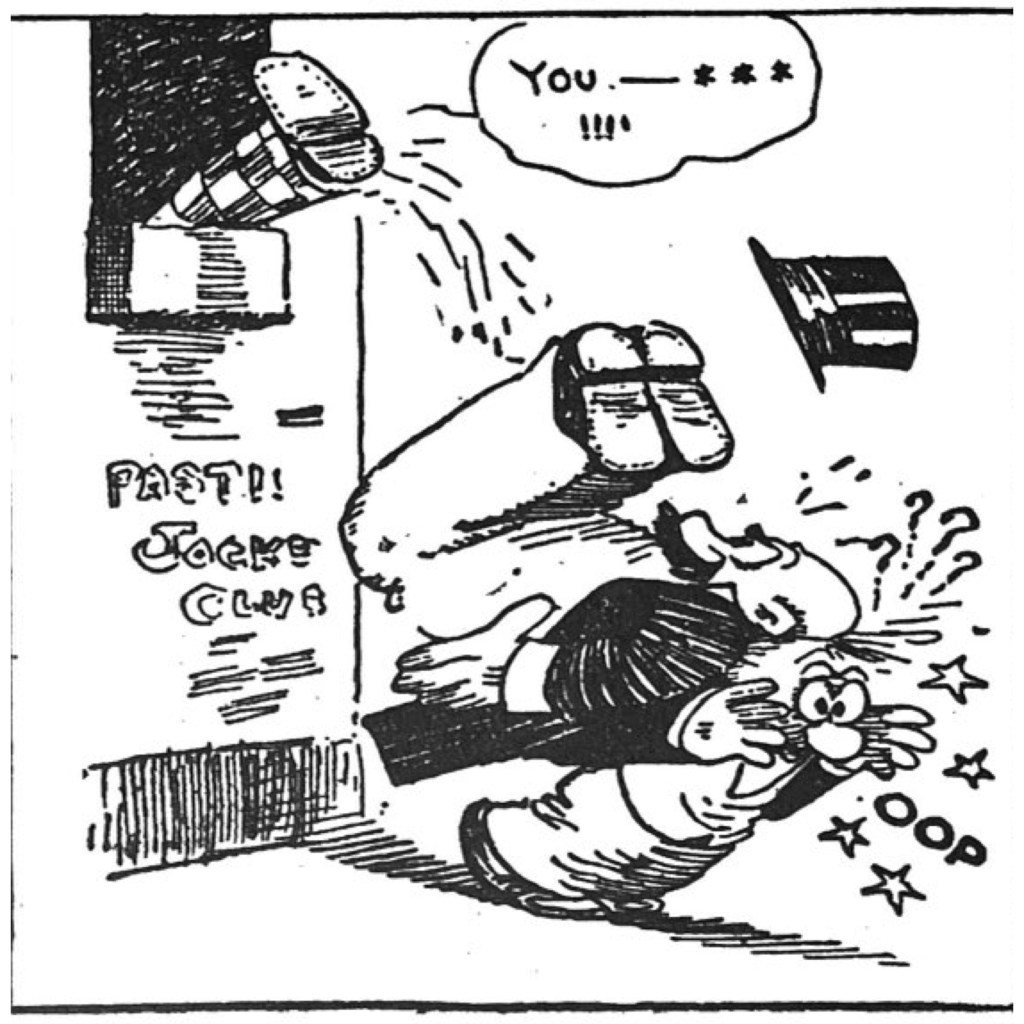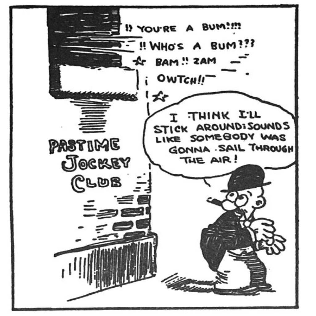 But the coming of Spark Plug also literally raised the stakes for Barney’s conniving. Now he is on a larger stage, traversing the country with Sparky, plotting to get race entry fees, looking for shortcuts. And his fortunes rise and fall radically, from wealthy purses Sparky wins to big bets that come cup a cropper. And Barney starts looking the part, now donning a top hat and formal coat. He has evolved from petty existential haplessness to riding up and down the rollercoaster of American pluck and luck. Barney Google becomes both a celebration and satire of American ambition. He is always on the make, looking for the big chance, and a universe of pitiless institutions, authorities and chance bounce this compressed ball of a character up and down fortune’s wheel. DeBeck is working in a grand tradition of American comic archetypes and echoing some of the tropes that were driving the great slapstick silent clowns of the same decade. Chaplin, Lloyd and Keaton also explored the marginal man, luckless but big-hearted and managing an absurd cosmos with clever survival skills.