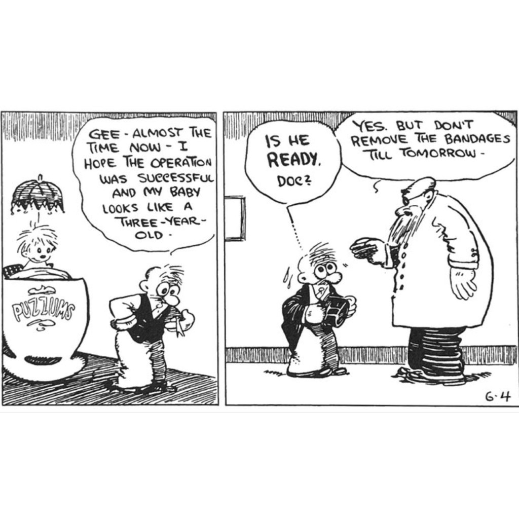 As DeBeck came to understand his own character, Barney literally shrank in stature, from a tall but stooped supplicant to a figure half that original size, now more crushed than stooped, a compact underling of life whose famously oversized “google eyes” always seems to be looking up at other characters. With so little space between Barney’s nose, mouth, torso and legs, he looks like a crumpled ball of formerly human features, the visual embodiment of a man pressed down into a diminutive stature.