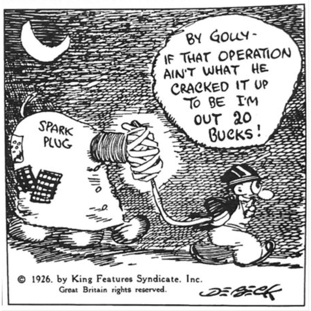 And there was relentless scheming, DeBeck knew no bounds in dreaming up ways that Barney could make money, thwart rules, fool race officials, or just cheat to help Spark Plug win. In the strip above he gets Sparky a facelift in order to convince the race judges that his horse is a genuine three-year-old.