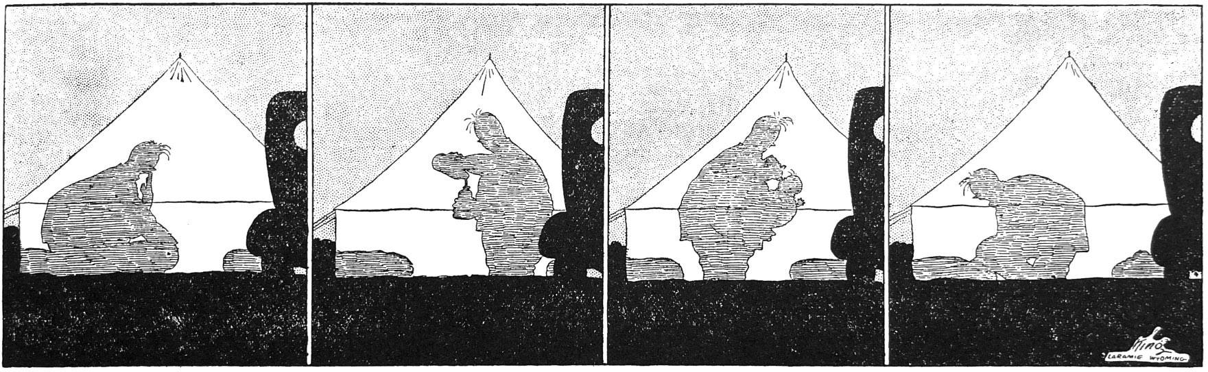 King’s talents ran deeper. The little gestures and moments of emotional significance were his terrain. And he created a perspective for the reader that was more giving and loving than the grumpy, shallow nostalgia and easy irony effected by rest of the comic page. In the Thanksgiving 1921 image above we see the classic gender divide that fuels much of comicdom. But in King’s hands it is rendered as separate but mutually respectful spheres. During a road trip to National Parks, King creates a strip of panels depicting passersby waving hello to the travelers. It is a quiet testament to quiet human connection.