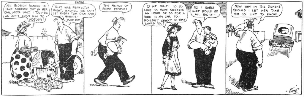 Start with the visual center and emotional heart of the strip – the doughy, roly-poly Walt Wallet. Visually, Walt is the opposite of the typical bigfoot characters around him on the comics page. His is not the squash, big-headed figure of Fisher’s Jeff (Mutt and Jeff), McManus’s Jiggs (Bringing Up Father), Milt Gross’s Pop (Nize Baby) or DeBeck’s Barney Google. Walt is the inverse bigfoot – massive, but impossibly small-headed and relatively small-footed. King usually depicts him as a mass divided by ink black trousers and white button-down shirt. He is often canting forward and seems ready to teeter. He is all-heart, all pillowy comfort. And while he dominates most panels in form he never dominates in spirit. With the arrival of Skeezix in 1921, Walt becomes the most unlikely of pop culture males – the sensitive man-nurturer – perhaps the only one in American pop and literary culture at the time. And like his visual contrast to other strips, Walt is apart from the bloviating, scheming satirized fathers like Andy Gump, Barney Google, Moon Mullins. And Perhaps King meant this Walt’s weight problem is baked into the character from the start.