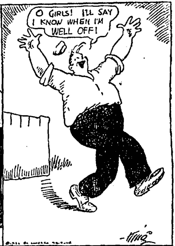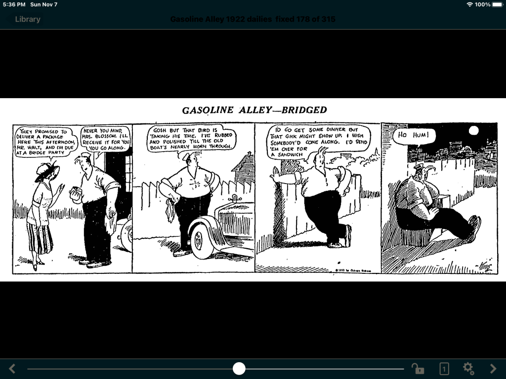 Much of 1922 is spent on a romantic slow burn of Walt coming to realize what the reader and his friends already know – that he is in love with newcomer Mrs. Blossom. Walt is a confirmed bachelor. A signature Gasoline Alley sequence shows some awkward domestic exchange among Bill, Avery or Doc and their respective wives, ending in a panel of Walt strutting away declaring how he is so “well off” being single.