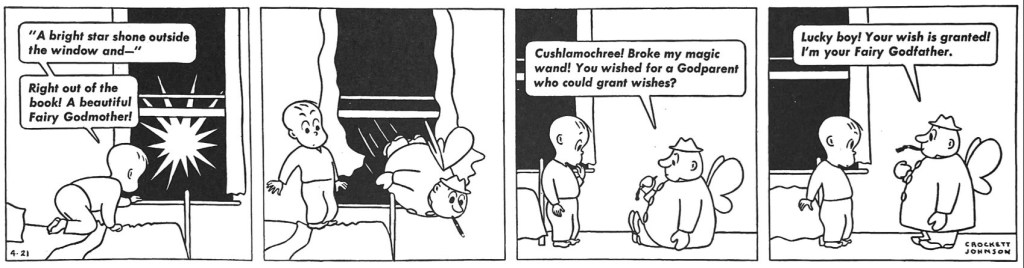 Bob had excellent taste in comics. He was thrilled that Fantagraphics was reprinting one of his youthful favorites, Crockett Johnson’s Barnaby. Starting in 1942, this wild tale of a boy, Barnaby, and his cagey, cigar-smoking, scallawag Fairy Godfather Mr. O’Malley is a singular American classic Bob pushed me to appreciate. I didn’t warm to it immediately but have come to appreciate this wry take on parenting, childhood and modern American life.