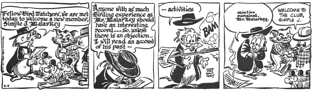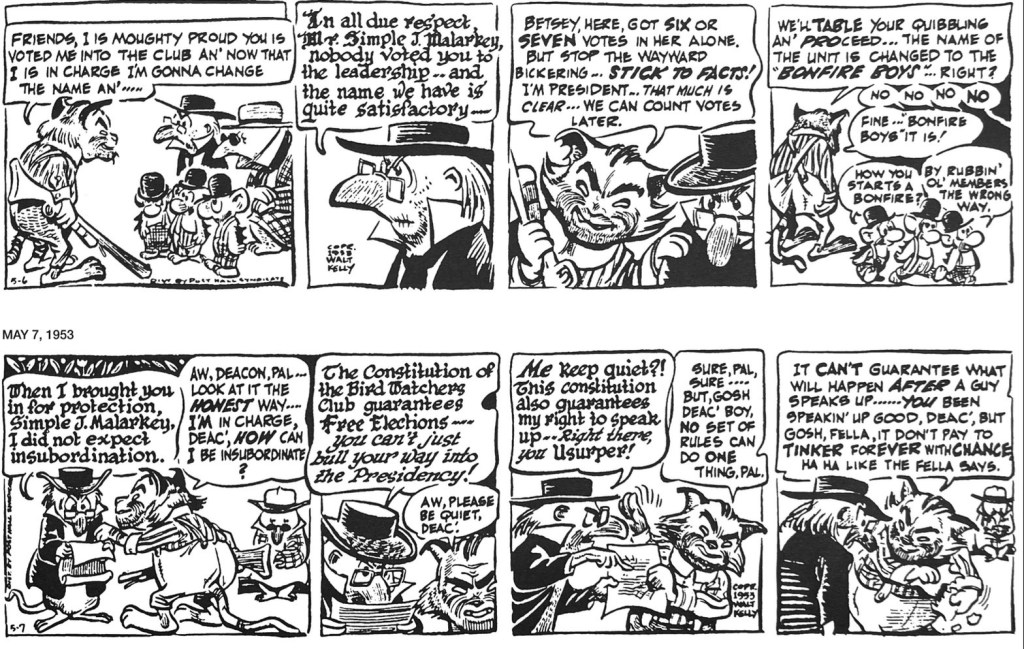 Bob’s liberal politics were well-aligned with Kelly’s regular bouts with right-wing excess. Pogo’s most famous poke at the right was his brilliant send-up of Joe McCarthy’s thuggishness in 1953. This sequence from May, 1953 is especially timeless. Swap in a more recent faux populist, proto-fascist and you have a strip that’s as relevant today as it was 69 years ago.