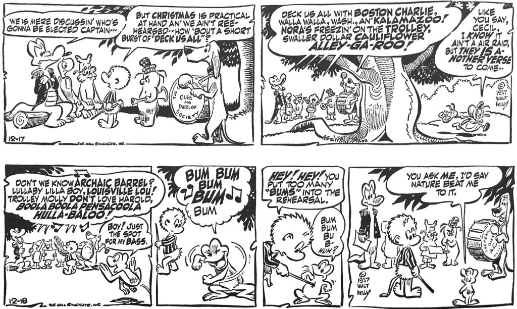 Bob was especially fond of the Pogo songbook and Kelly’s artfully fractured versions of familiar standards. The joke at the core of “Deck Us All With Boston Charlie” is that none of us remembers the full lyrics to Christmas Carols. Kelly’s crew, however, have trouble remembering their own wrong version of the song. And so in Okefenokee Swamp, during every year’s run-up to Christmas, Kelly comes at the same joke in different ways.