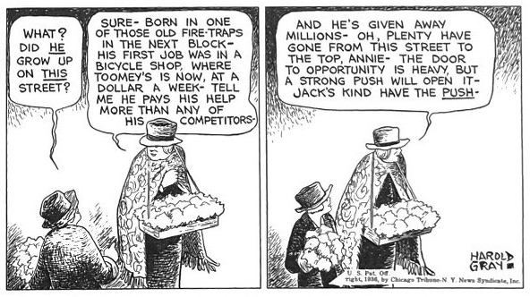 No one ever accused Harold Gray of subtlety. Annie was as much folk punditry as it was an adventure. But he was artful, albeit dogged, in creating opportunities for his avatars to voice another homily. A street fight triggers bromides on rising out of the “hard kindergarten” of the streets. Passersby making an offhanded comment on these city kids not getting a chance in life set up Ginger’s counter-argument about the dangers of unearned advantage. Meeting an old friend lets her reflect on the morality and generosity of earned wealth. And all of this in just three strips.