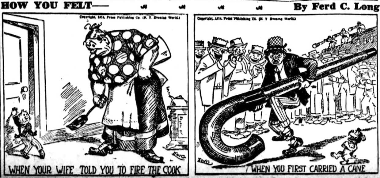 I don’t know who this Ferd. C Long was, nor how long the engaging “How You Felt” strip ran. But it captured me instantly as a great example of early cartoon experiments that explored some of the unique qualities of the new medium. The great team at Barnacle Press, who nobly harvest every scrap of early comic strips they can, gathered these. Like many strips of the day, it took up a simple single conceit – in this case using visual exaggeration to capture a feeling. The result is a fantastic surrealism that communicates in a singular way a range of small and common responses to the world.
