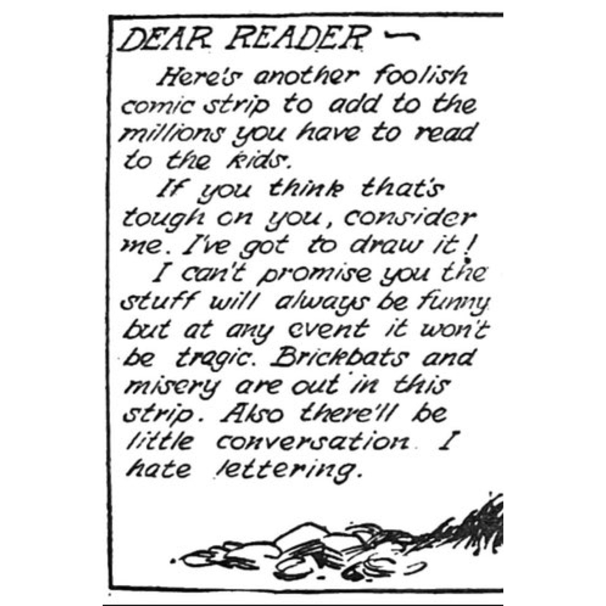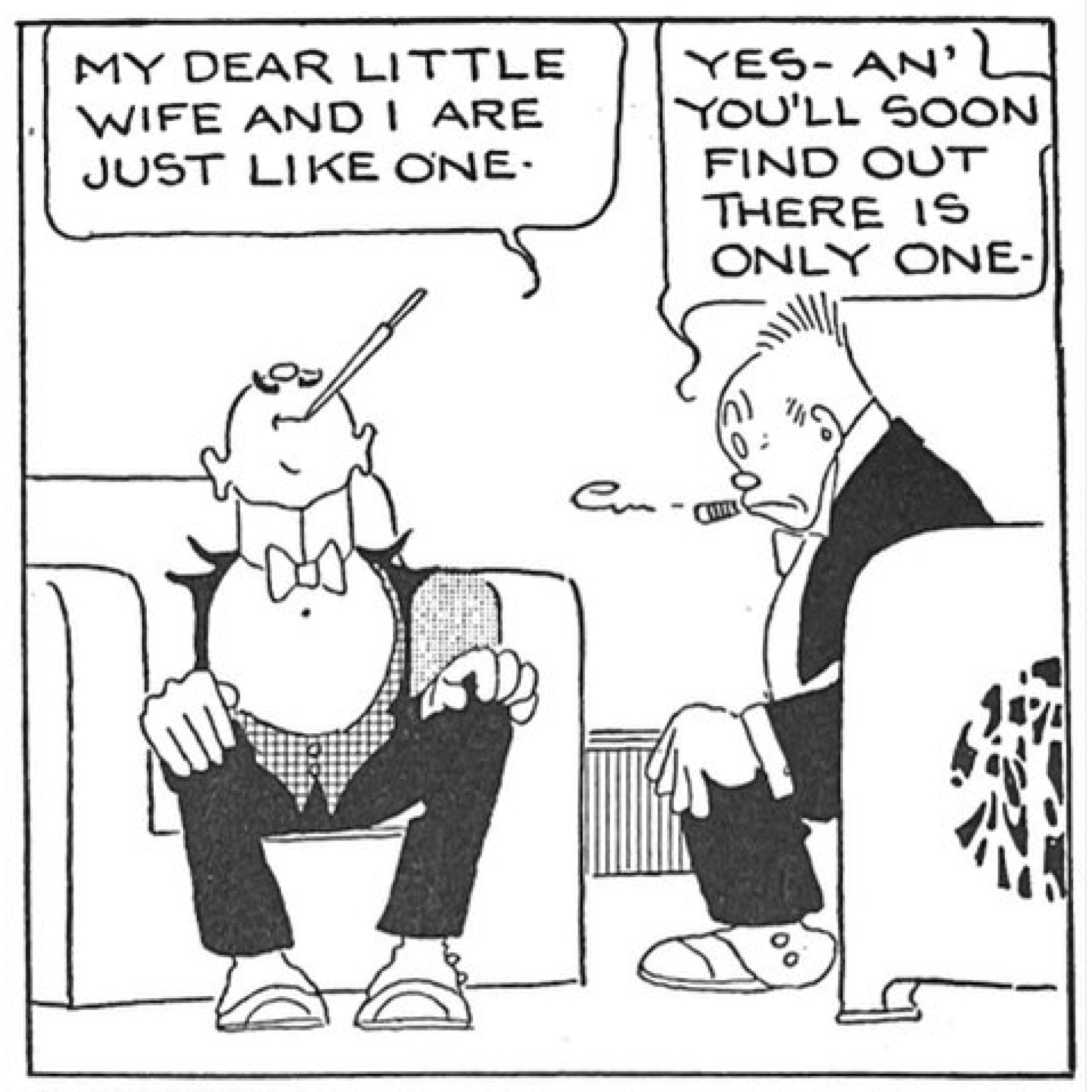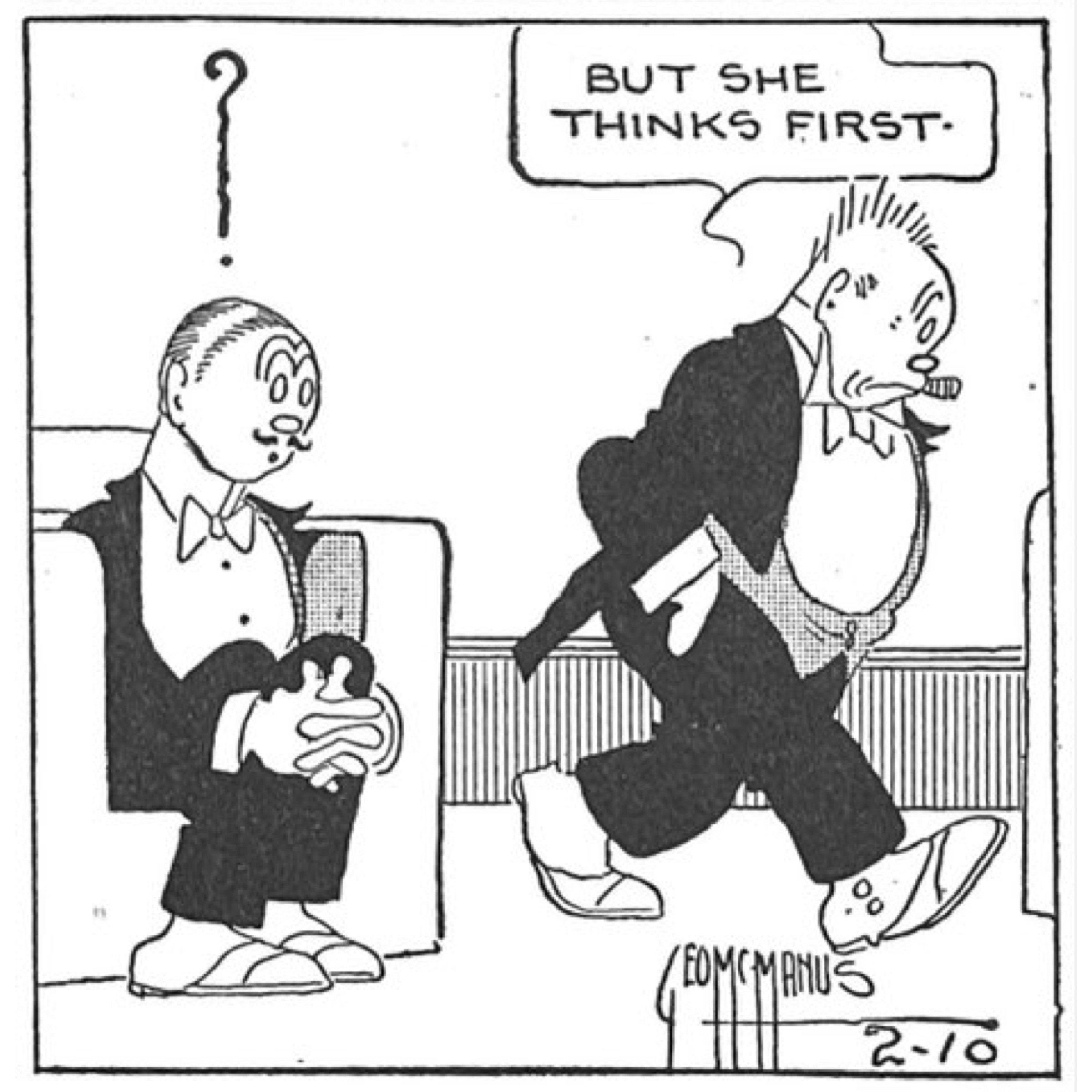 Comic disharmony between Jiggs and Maggie over their social climb was the central joke of George McManus’s Bringing Up Father for over four decades. For all of McManus’s fine sense of humor, he banged that one note across four panels six days a week and a full page every Sunday. To be sure, he layered in nuances of class and generational conflict. Jiggs was a hod carrier who struck it rich, never adjusted to his own ascent, and clashed with wife Maggie and daughter’s ambitions to join the social elite. The dynamic was rich with potential and embodied the experience of millions of American emigrees moving into the modern middle class. But many of the daily strips tediously replayed Jiggs’s sneaking out to his former watering hole Dinty Moore’s, embarrassing his family with etiquette transgressions or ducking Maggie’s thrown dishes. These were conventions that American newspaper readers enjoyed hearing for a handful of panels and 30 seconds a day over its 87-year run. McManus, however, was especially adept at maintaining reader interest in the familiar with his mastery of visual style, panel sequencing and timing.