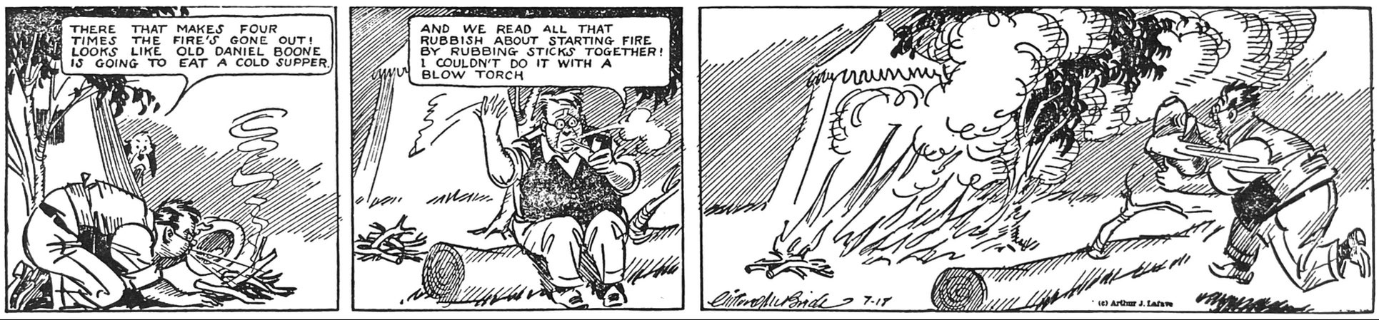 The strip is mostly a pantomime where mishaps of one kind or another unfold in a three or four panel sequence. Dialogue (usually Elby talking to himself or Napoleon) is rare. The art of the strip is in McBride’s comfortable illustrative style, a rough use of loose line and acute hatching, a knack for panel sequencing and rhythm of movement. Elby falling in a lake feels funnier than it should because McBride’s panel progression relies on a touch of surprise. Whereas the screwball timing of Opper, Goldberg or Gross lets us enjoy an obvious disaster unfold in gleeful animation panel by panel, McBride’s pay-off panel is usually an oversized tableaux of an unexpected outcome. This is physical humor but of a more contained, less socially subversive sort than the great screwballism.
