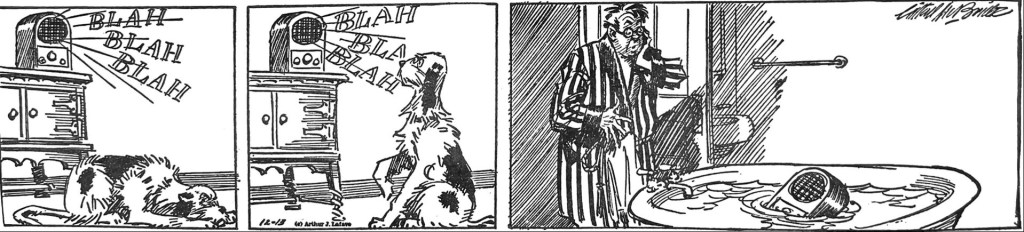 Clifford McBride’s portrait of the affable, accident-prone and corpulent Uncle Elby and his puckish oversized dog Napoleon is one of those great American comic strips that are about nothing. There is no adventure or much of an ongoing storyline to the Napoleon and Uncle Elby strip. Nor are there gags, verbal or physical, really. It is more a strip about everyday mishaps. Uncle Elby is proud of his new white suit, which an affectionate Napoleon meets at the the front door with muddy paws. Constructing a simple tent results in a tangled mess. Napoleon chases a fleeing rabbit, chicken, cat or whatnot (it’s a frequent theme), only to be chased by his prey in the end. Elby mows over one of his dog’s hidden bones, which conks him on the bean. Elby gets out of his car to open the garage door only to have it slam shut before he can drive through.
