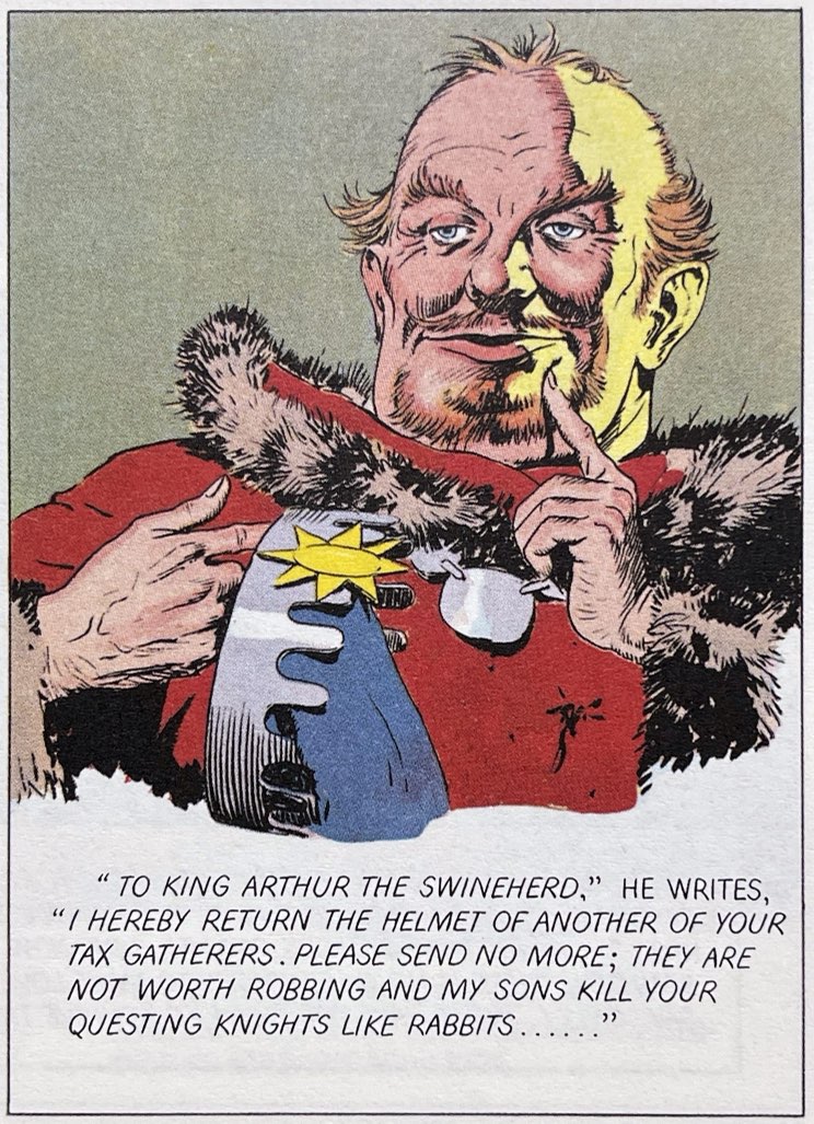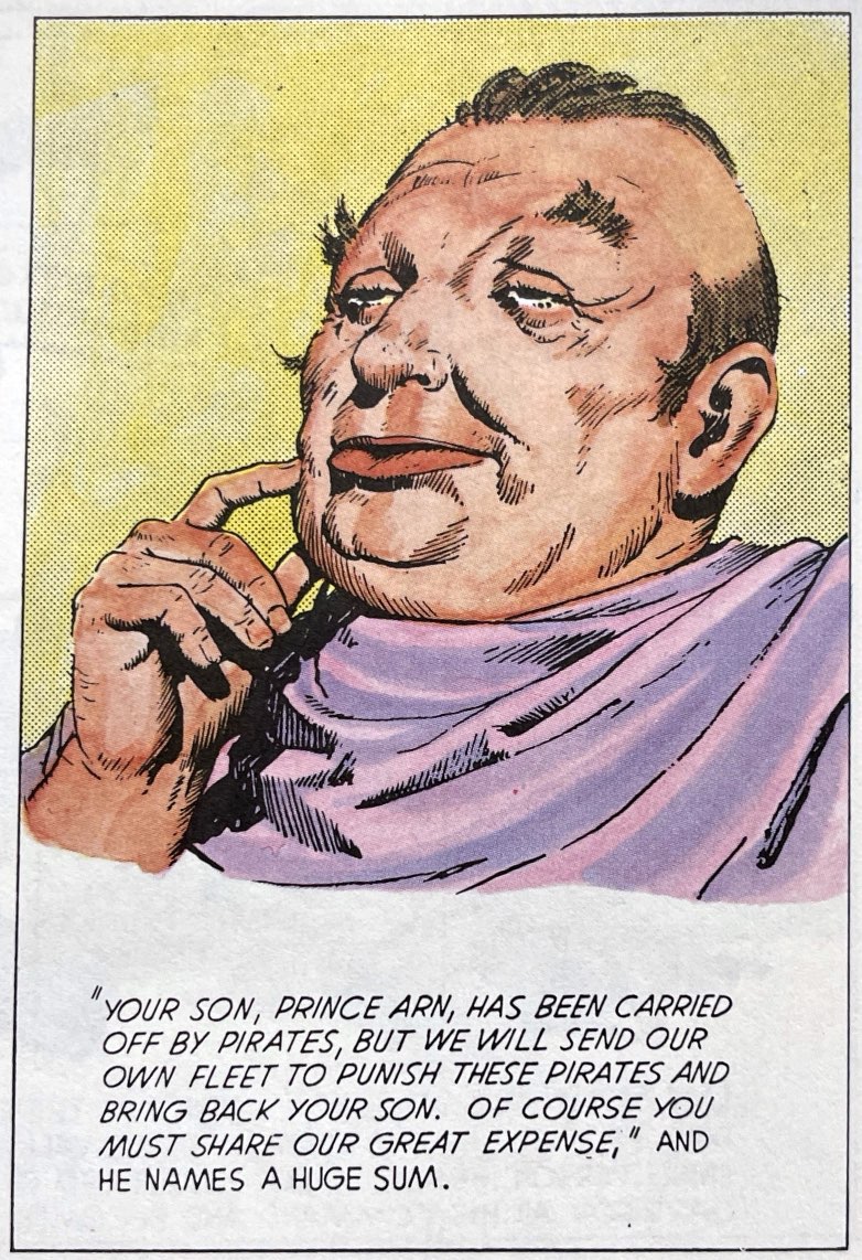 Part of the regal (i.e. elitist) fantasy at the heart of Prince Valiant is that all good and evil emanates from a society’s leaders, from the top down. And so the major villains in the strip are twisted leaders. Some are just power mad or motivated by petty resentments. But others represent softer, often more calculating personality types who warp or oppress the body politic. And Foster often depicts these bad leaders as visually softer, often mildly effeminate, gluttonous, selfish. Here Foster uses half-closed eyes as a symbol of detachment and disdain. But he also marshals hand gestures, smirking lips, narrow foreheads to visualize perhaps a less masculine and forceful kind of manipulativeness. In the “False Duke” character above Foster couldn’t be coding his villain any more explicitly.
