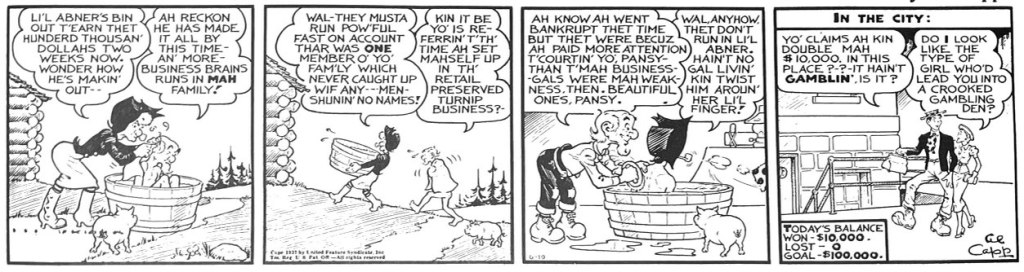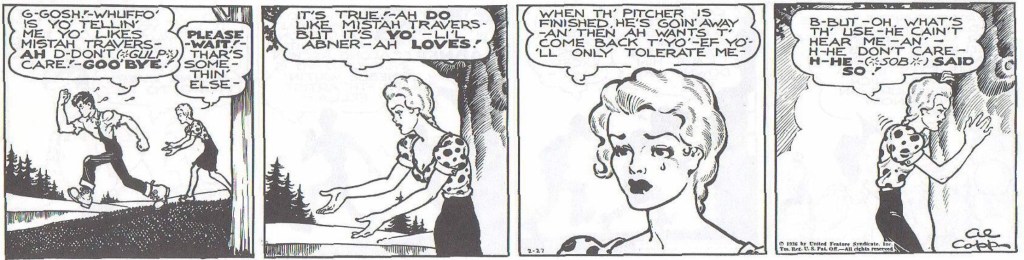 But there is a lot going on here as well that I am not sure other critics have noticed or wanted to admit about Capp. A lot of the interpersonal action among Li’l Abner’s heroic core cast is about affection, protecting one another’s feelings, being easily hurt. Abner wanting to spare Abijah from feeling jealous or hurt is what animates the sequence. And tending to one another’s feelings is an important theme in this sitcom family. In an earlier post, I noted how the assertive matriarch Mammy Yokum is careful to guard her clearly subordinate husband from humiliation and a hurt male ego. And for more than a dozen years, one of the primary frames for the tale of Dogpatch and the Yokums is the heartache of Daisy Mae’s unrequited love for Abner, who is less asexual (as he thinks) than staggeringly un-self-realized. For many years, Daisy is mainly portrayed teary-eyed and swooning in pain over Abner’s latest obliviousness to her love. And of course the supremely sublimated Abner can make no sense of his own feelings for her. This dynamic fuels many Daisy Mae misfires to make Abner jealous, and Abner trying to talk himself out of his obvious love for Daisy.