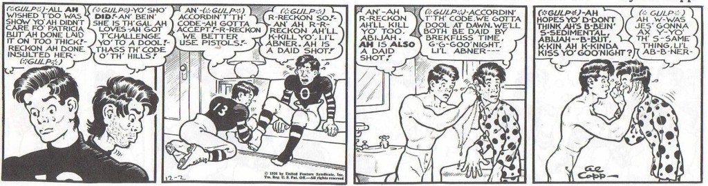 And so, Capp’s usual comic labyrinth of schemes, misunderstandings and misplaced honor lead to both friends trapped by immutable tradition and this remarkable profession of their mutual affection. And as is also typical with Capp, the impossible situation resolves itself via yet another misunderstanding…Abner’s of the details of the dueling code. Who knew there was an age limit?