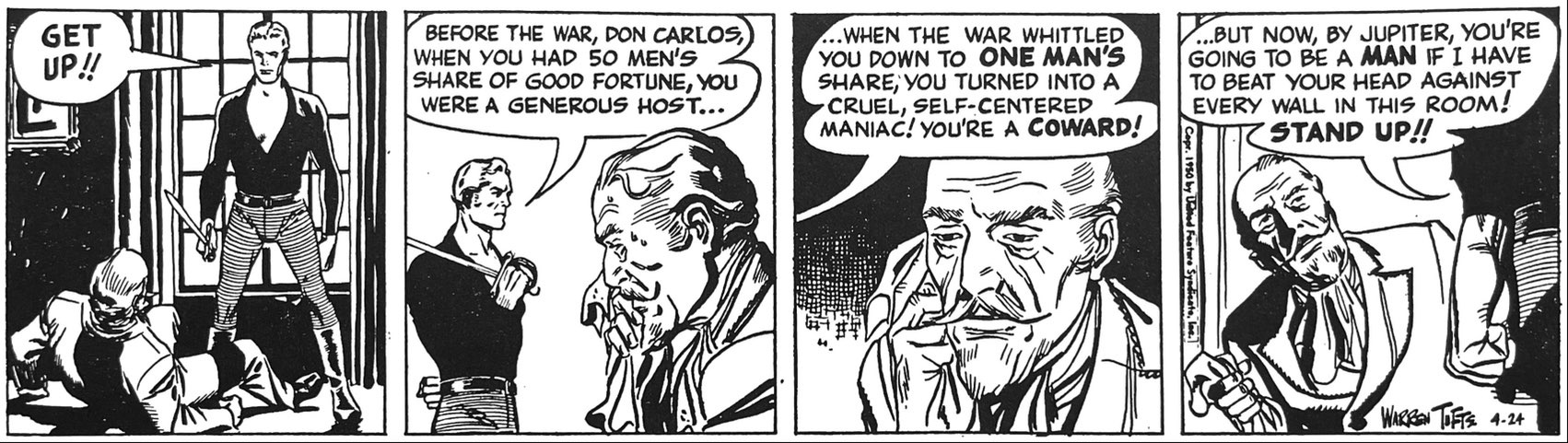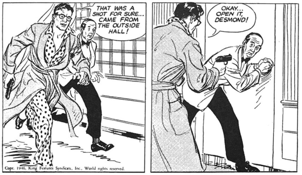 In the first days of Alex “Flash Gordon” Raymond’s post-WWII detective adventure Rip Kirby, it was clear the master was going to redefine the look of comic strip adventure. Day two of the March 1946 launch story speaks volumes about the influence Raymond was going to have on a decade of 50’s adventure style. The panel progression here is so engaging. The first two panels are energized so that you can almost feel the weight of the murder victim slump into Kirby’s arms and instantly change valence of the scene. And that final close up communicates the deadly reality of the situation by bringing us right into the complex reaction to beauty and death. The photo-realism is here, as is the increasing influence of cinematic points of view, timing, and close-ups. And arguably, the next decade would also see in comic strip adventure a turn inwards, toward psychological realism, the emotional lives of characters, that accompanied the more photographic style of the art. All of these elements would be deployed in different ways by Stan Drake in the Heart of Juliet Jones, Leonard Starr in On Stage, Warren Tufts in Casey Ruggles and Lance and John Cullen Murphy in Big Ben Bolt.