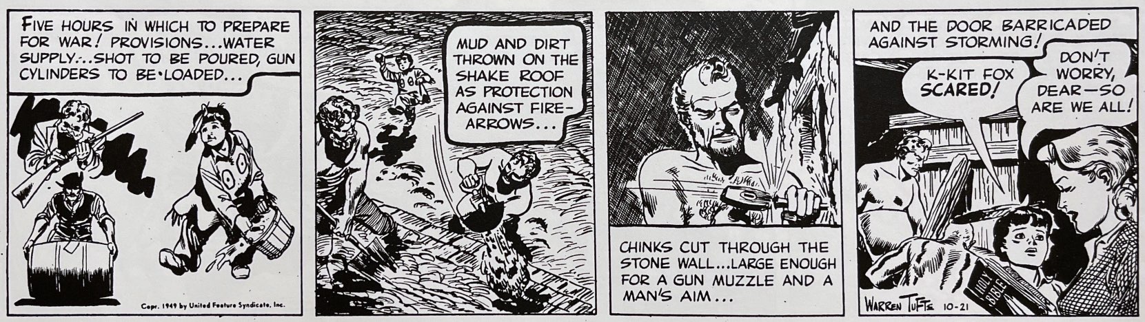 Early in the life of the strip, presumably when Tufts was still flush with his initial research, we get wonderful practical detail like the preparation for an Indian attack below. Throwing wet mud on shingled roofs to thwart flaming arrows and driving aiming and shooting holes into stone walls is a level of detail you will never see in comic and film oaters of the day. And yet, the untutored and inexperienced Tufts also showed a mastery of comic strip form that more experienced cartoonists lacked. He never lets that detail overwhelm the narrative. The final panel brings us back to the emoptional reality of the drama.