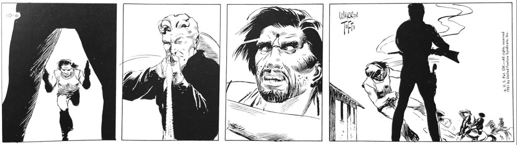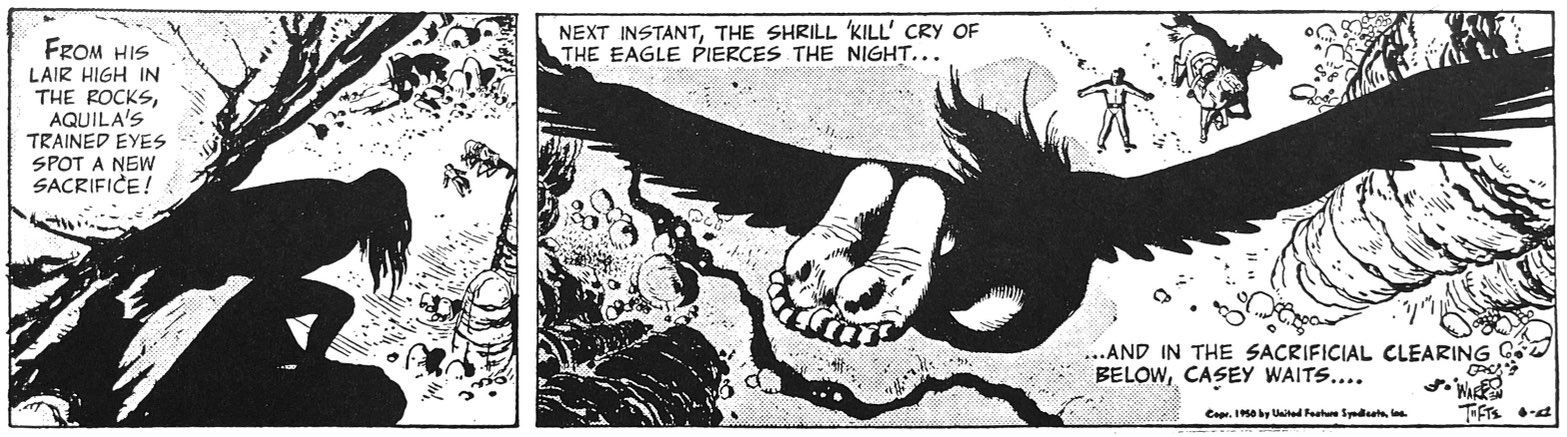 Somehow Tufts got away with a remarkable explicitness. His liberal depiction of violence was neither gratuitous nor antiseptic. He had Raymond’s talent for visualizing fight and battle sequences with naturalistic dynamism. His warriors put their whole bodies into their punches, and the impact was palpable. Likewise, the violence had real emotional consequences in characters’ lives and the community. And he shows that violence with the intention of it having a similar impact on us. The villain Juan Soto is shot cleanly and in close-up through the forehead. A local tribe treats the marauding eagle-man Aquila as a god and stakes a half-naked woman from the tribe out as a human sacrifice. And this is the only instance I know where a fully exposed topless woman is depicted in the comics pages of American family newspapers. This was the gritty and raw frontier we would only see on screen over a decade later in the revisionist Westerns like Sam Peckinpah’s The Wild Bunch or Robert Altman’s McCabe and Mrs. Miller.