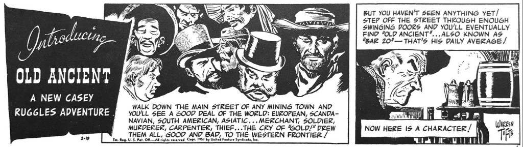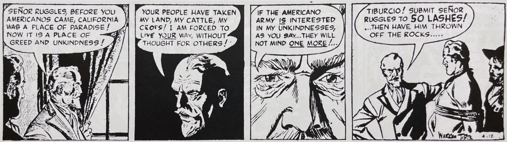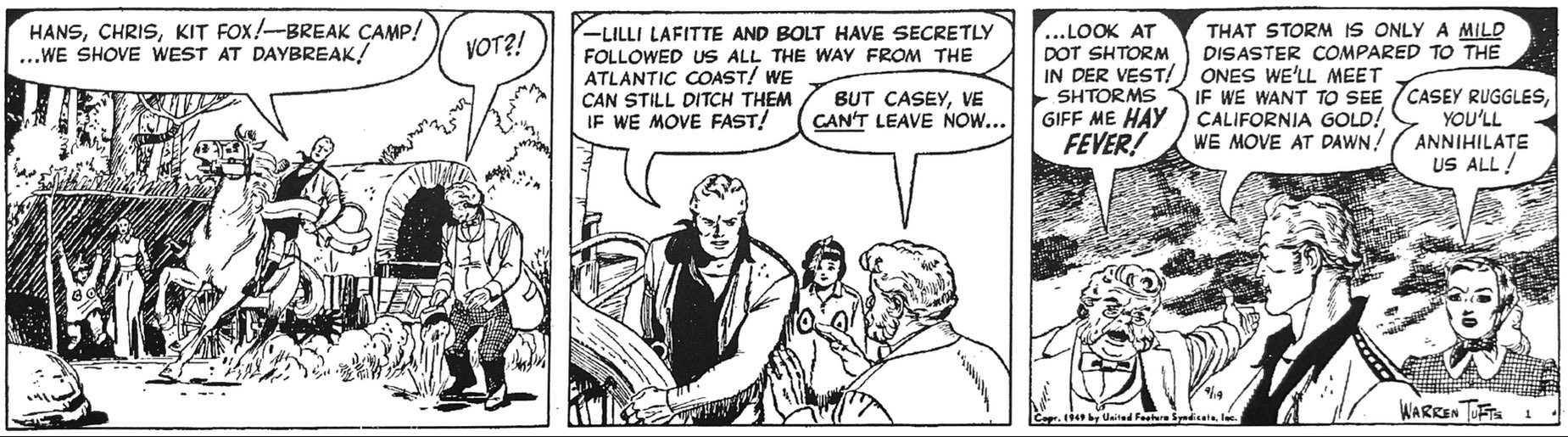 Warren Tufts (1925-1982) was a self-taught artist and historian of the mid-19th Century Westward migration, and he combined both avocations into two of the most compelling and distinct adventure strips of the 1950s. In Casey Ruggles (1949-1954) and Lance (1955-1960) he brought visual and historical realism to an otherwise romanticized vision of the West that flourished in post-WWII  pop culture. In Tuft’s West of the 1840s, settlers were as often selfish, greedy, cowardly, incompetent, sadistic and capriciously violent as they were an heroic forward guard of civilization and commerce. Tufts had a mixed view of human nature that allowed all of these qualities, good and bad, to coexist in many of his characters.