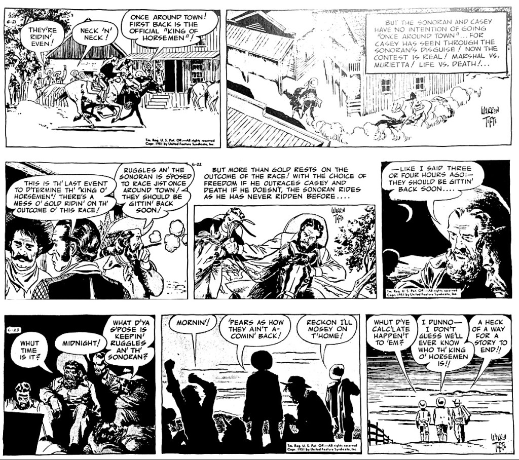 And a singular strength of Casey Ruggles was Tufts’s imaginative range. He injected many genres into his Western. One storyline finds a half-man, half bird (“Aquila”) figure terrorizing settles and tribes. In another a mystical cult leader hypnotizes people into doing his criminal bidding. Some stories incorporated historical figures and incidents like the hunting of real life marauder Juan Soto. And he played with genre expectation. He satirized the popular romanticization of the Old West in the tale of the “Old Ancient,” a cranky incompetent who strikes a ridiculous figure trying to be a frontier tough guy. And in one weird storyline, Casey takes on a challenger for the title “King of the Horsemen.” But Casey and his rival end the sequence by racing out of town for good with no winner. “A heck of a way for a story to end,” comments one townsman in the final panel of the storyline. Crime, suspense, romance, satire, occult — all mainstays of pulp, radio, film serial fiction – found their way