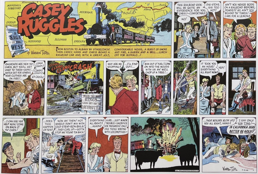 A native Californian raised on its historical lore, Tufts was passionate about educating his audience about the complexity and harshness of westward expansion. Casey Ruggles begins with the pre-Civil War California Gold Rush, and the first months of that strip are a wonderful immersion in the minutiae of the journey elided by genre westerns. We get an illustrated lesson in the tedium of loading the individual chambers of the earliest revolvers. We see how the earliest train rides were unsettlingly rough. Track ties would burst through passenger car floorboards. The engine would run out of fuel until passengers helped forage wood fuel from surrounding forests. And of course, the first crude boiler engines were prone to exploding. Tufts never lectured, however. He brought to the comics a strong sense of narrative pacing and characterization from years writing radio scripts, and was deft at weaving these bits of historical accuracy seamlessly into the story and adding to his