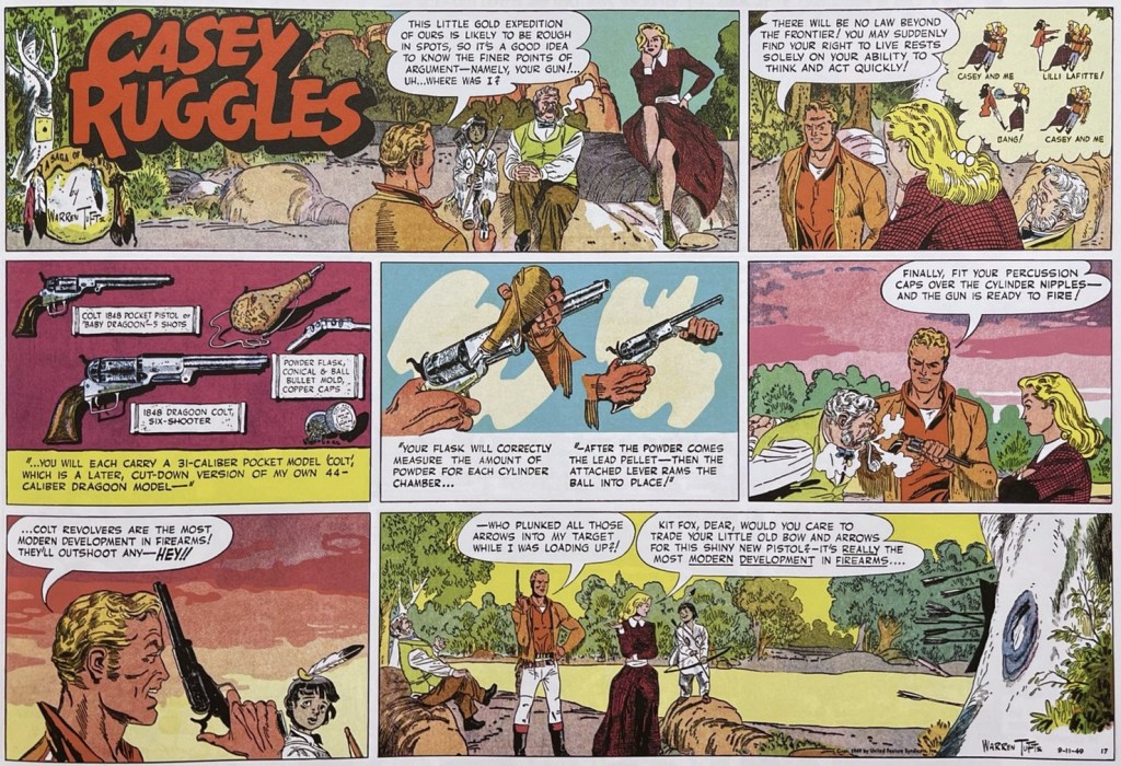 After short stints running radio stations and an ad agency, the California native decided he wanted to create a comic strip that captured his own boyhood enthusiasm for California history.. Tufts researched the Gold Rush thoroughly when preparing his pitch for Casey Ruggles, and his own childhood in that area of California was filled with lore. And so he was determined to bring the detail and challenging reality of the trek to this strip. This ironic take below on the technological sophistication of the revolver illustrates Tufts’ talent for weaving hard history with narrative. It is also worth noting Tufts’ early, clumsy attempt to depict female psychology. He got better, both at surfacing the psychological dimension of his characters and treating women as more than jealous romantics. But it is also true that like most Westerns, Casey Ruggles is essentially a contemplation of manhood, and especially the post-WWII cultural anxiety around over-civilization and perceived dwindling masculinity.