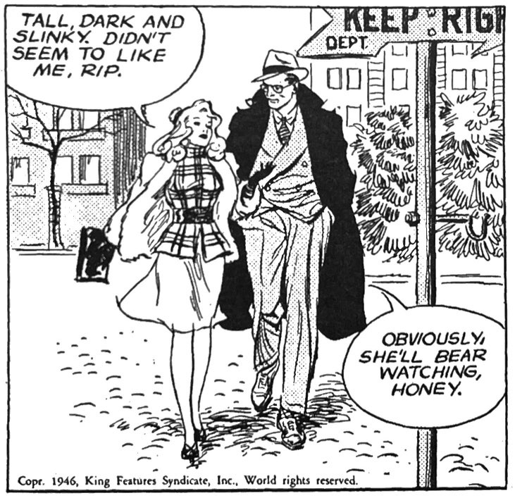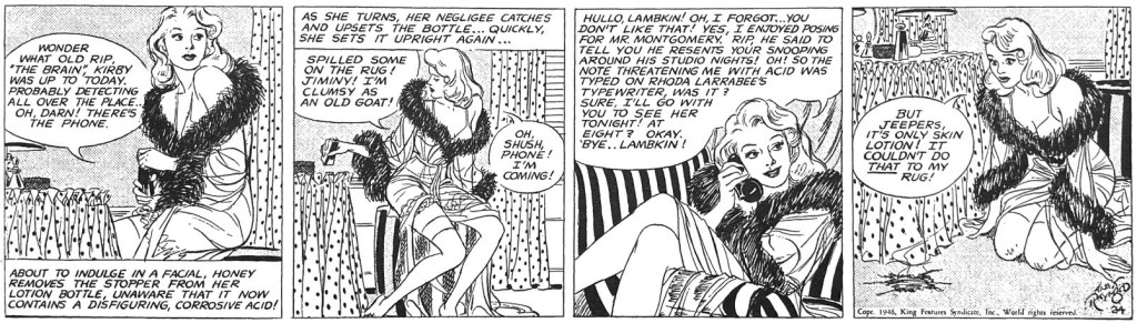Likewise he was revising, if marginally, the role cheesecake femininity played in comic strip adventure. While still decidedly under the male gaze and entwined in countless sexist tropes, Rip’s gal pal Honey is miles from Flash Gordon’s hapless and helpless Dale Arden. This strip below has an intimate sultriness that seems to come from peeping into the boudoir of a somewhat more independent and capable woman.