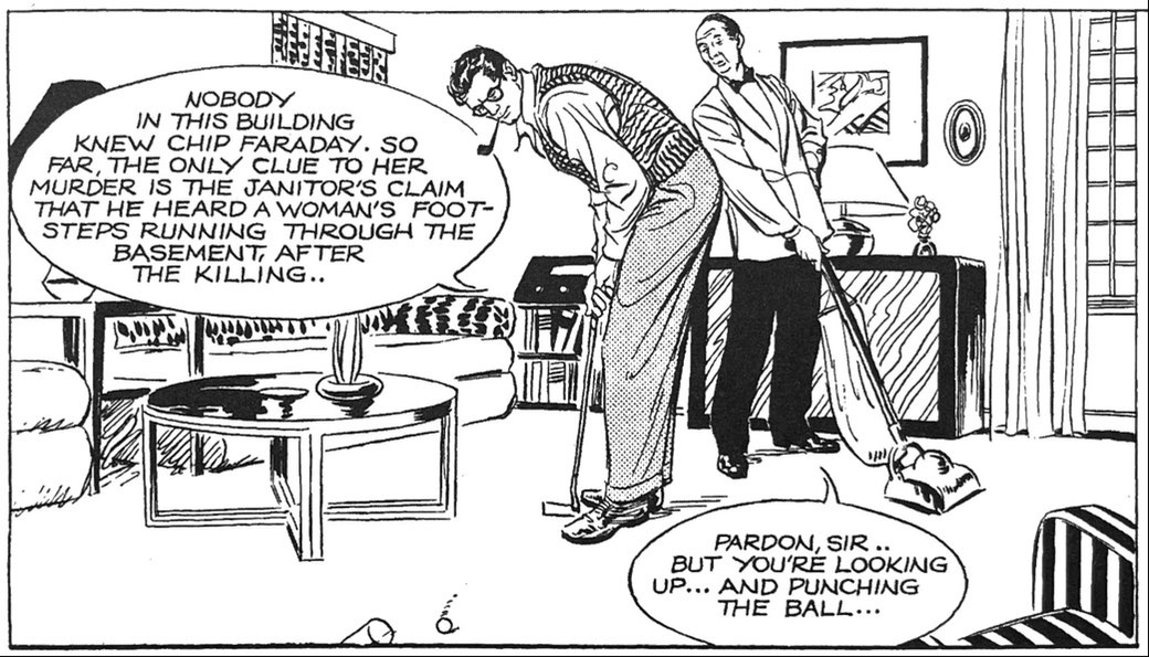 The first generation of comic artists were preoccupied with the new reality of the American city, which I explored at length here and here. But in the post-WWII era of suburbanization, material abundance and mid-century streamlining, Raymond’s urban landscape is defined by stylish objects, urbane banter and a feeling of intimacy. In many ways Rip Kirby was helping to define that new urban ideal of the sophisticated male that Hugh Hefner would enshrine in the world of Playboy and Hollywood would glamorize in the romantic comedies of the 50s.