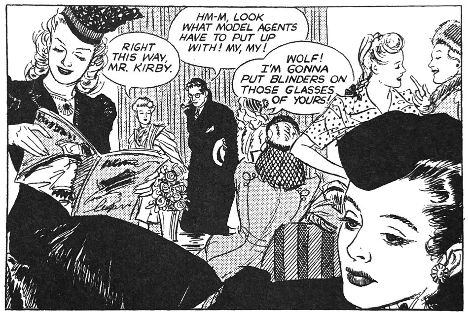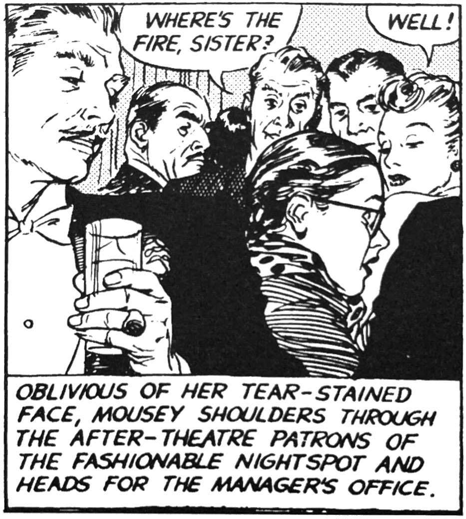 Even in this first Rip Kirby story cycle, just a few of Raymond’s post-war conceits become clear, He excelled at depicting the human clutter and closeness of the urban environment. He seemed to glory in drawing interiors filled with disparate faces. There are so many panels that bring us into crowded small spaces filled with faces with different angles and attitudes.