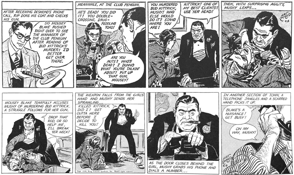 Raymond had a way with villainy. Ming the Merciless, of course, was his masterpiece of evil. It neatly melded Depression America’s suspicions about alien despots with its anti-Asian xenophobia and ambivalence towards science. But in shifting his focus to modern America, he drew together the strands of urban criminal iconography, the overfed, vaguely ethnic, drug-pusher Mushy. Dressing his villain”s beastly bulk ironically in an inky tuxedo, Raymond moves that hulking figure from panel to panel is wonderfully menacing ways. third panel on the bottom strip hits one of those notes Raymond played best, that quiet beat after a flurry of tension (see the Day two sequence above) that makes the viewer settle in the contemplate the meaning of the scene. I love the way Mushy seems to be squeezed into the panel itself, almost too cramped to dial the phone. It fills the frame with his brutish menace and increasing desperation. Like Warren Tufts, Raymond gave every four-panel daily a self-contained arc of story or emotion. He showed a deep understanding of the unique aesthetic potential of the form.