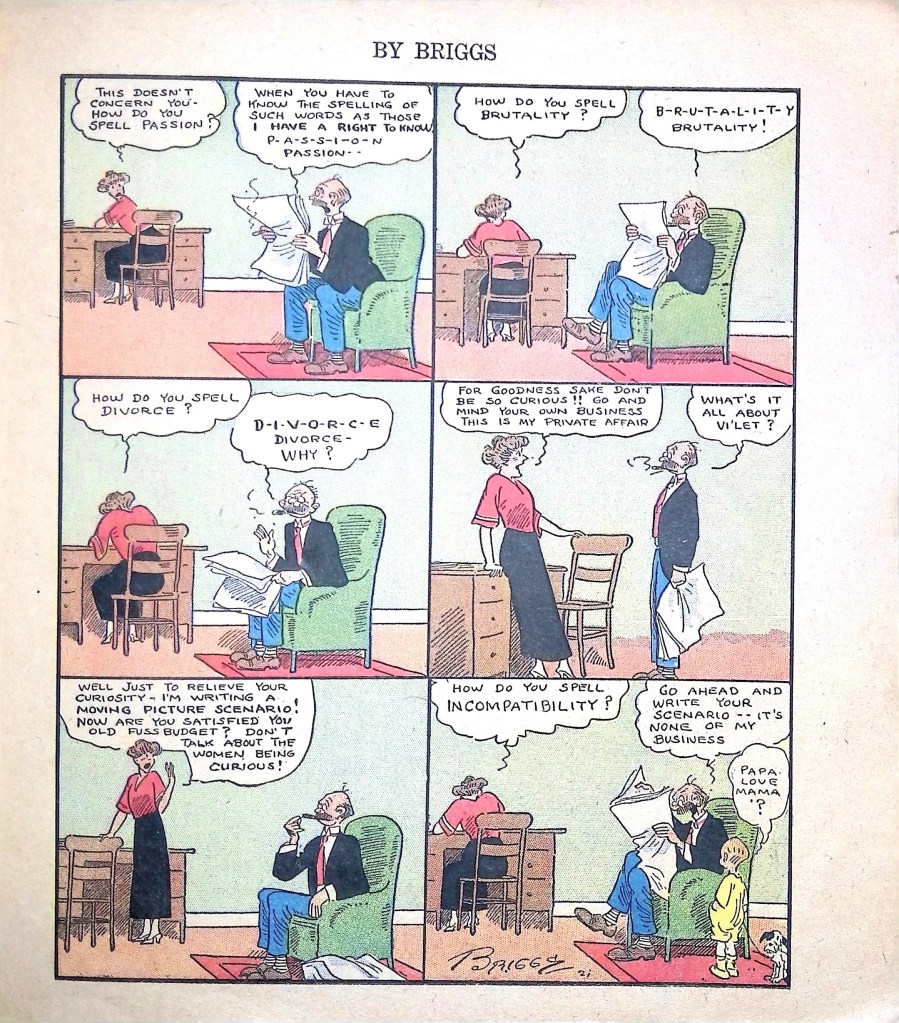 Clare Briggs was more than a heartwarming sentimentalist, however. His Real Folks at Home strip was a remarkably insightful and counter-cultural tribute to the dignity of work and the innate creativity of otherwise invisible laborers. But in Mr. and Mrs. we see Briggs with a sharper edge. Joe and Violet Green are a married couple at odds with each other, with the world and even with marriage itself. Joe and Vi are habitual bickerers, and this is not novel to the domestic strip. Maggie is forever throwing dishes and rolling pins at Jiggs. George and Peg Bungle pick at each other and the neighbors with piercing jibes. Marital tension and the war of the sexes is the fodder of the family sit-com genre that originated in the American comic strip. But Briggs’ Green in Mr. and Mrs. are different and more bitter. McManus’s Maggie and Jiggs are obvious burlesques. Tuthill’s The Bungles represent a more nuanced and oddly loving vision of marriage. Joe and Vi are more piercing, genuinely disgruntled. And Briggs brings a dark humor to the simmering resentments that simmer within their hearts. The 1922 Sunday below is among the wittiest. At her desk, Vi keeps asking Joe for spelling help on a series of ominous words: MURDER, SUICIDE, POISON, DIVORCE.