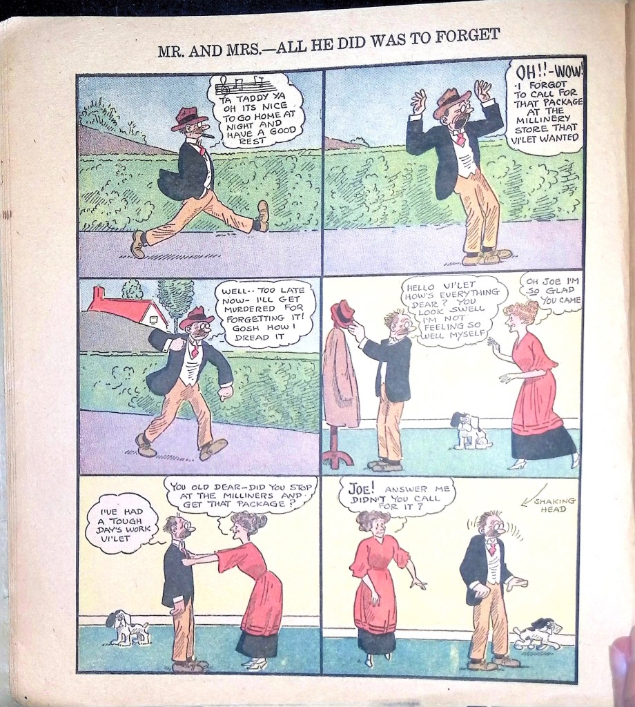 Mr. and Mrs. was a seven day strip, but I have only seen Sundays, like the scans here taken from a 1922 reprint. I cannot say how the Greens behaved towards one another on a daily basis. But if anyone can point me to examples of the dailies I would love to expand this cursory view of the strip.