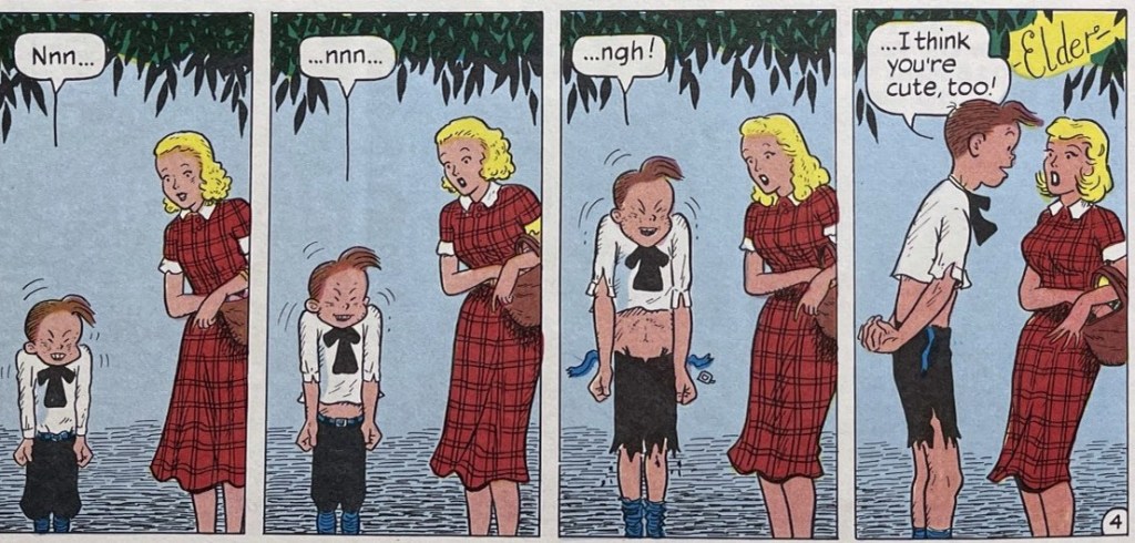 The common Kurtzman satirical move was to inject realistic characterization into pop culture that thrived on heroism and idealizations. And he loved to make his parodies self-aware of their fictional status. Here Skeezix is frustrated with one of the famous innovations of Gasoline Alley, allowing its principals to age. Again, Kurtzman’s genius was for exaggerating to absurdity one of the familiar themes of his target. Skeezix grows up right quick at the sight of the older girl next door. And he underscores the realism by keeping the clothes the same boyish size. Note Elder’s dead on capture of Frank King’s visual signatures, even down to the lettering.