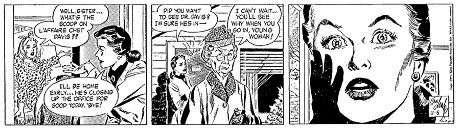 Drake also worked in a three-panel cadence, usually in medium close-up framing of two character dialog. There was a lot of space for reaction shots and close-up pay-off frames that highlighted Drake’s talent for facial expression. More than his peers of the 50s (Raymond in Rip Kirby, Caniff in Steve Canyon, or even Kelly in Pogo, Capp in Li’l Abner, or Johnson in Barnaby) Drake relied most on this demanding three-panel snippet of daily storytelling. It was demanding in that it forced Drake to move the story along and deliver some level of emotional impact and cliffhanger for the next day. And it was very much in the romance genre, surfacing the internal lives of characters and resonating emotional notes day to day. These were adventures of the heart.
