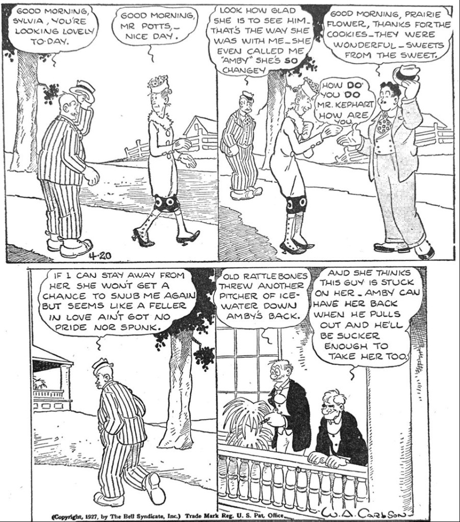 But in The Nebbs, that internal turmoil is juxtaposed with the external judgments and kibitzing of an enmeshed community of family, friends and neighbors. These onlookers are at once sympathetic and supportive, pitiless and mocking. Hess’s take on the insularity of the small town is distinct from King’s tightly knit Gasoline Alley. He gives his characters sharper tongues and more strident opinions on everyone else’s business. While not as jaded as Tuthill’s view of American social life in The Bungle Family, Hess is less sentimental about the familiarity of the small town, its pros and cons, than King. As Sylvia’s antagonist, the housemaid Mrs. Gruntly tells her sharply in one exchange, this is a place where “everybody knows everybody else and nobody can fool anybody.” Gruntly targets Sylvia’s primping to attract a man with her own class resentment or competitiveness. Meanwhile, Amby is subject to the mockery of Rudy Nebbs and a hotel clerk, who chortle over the rich cousin’s awkward courting.