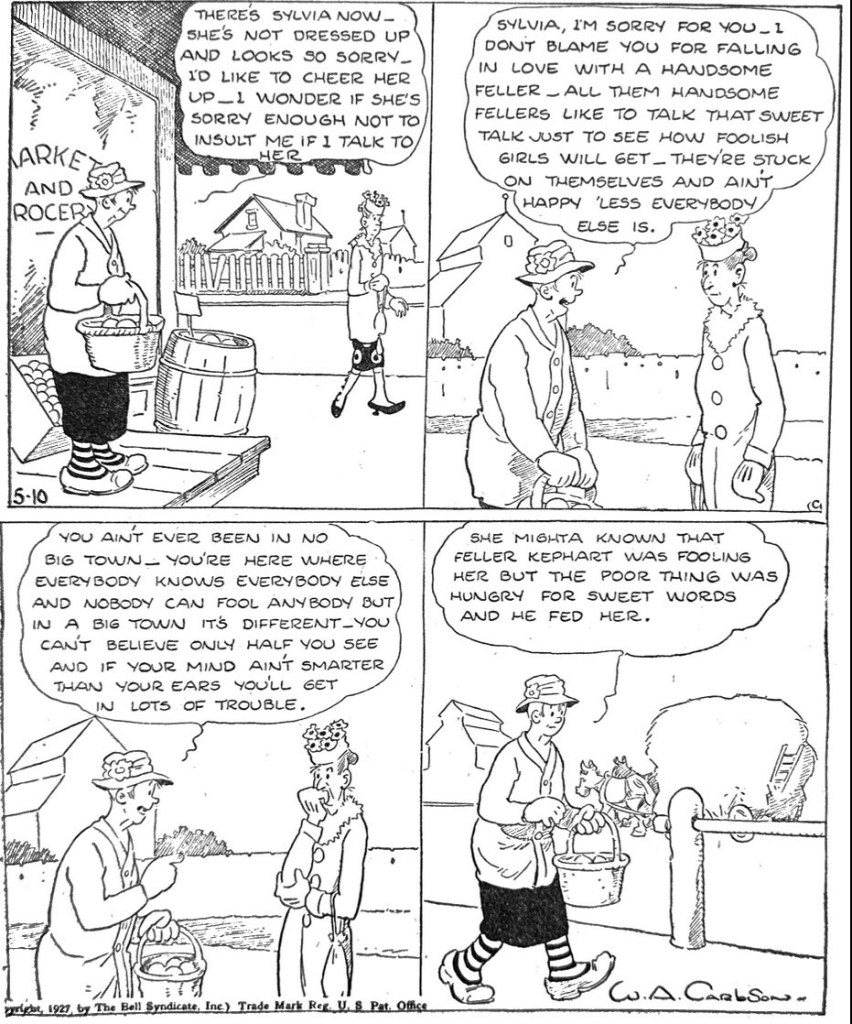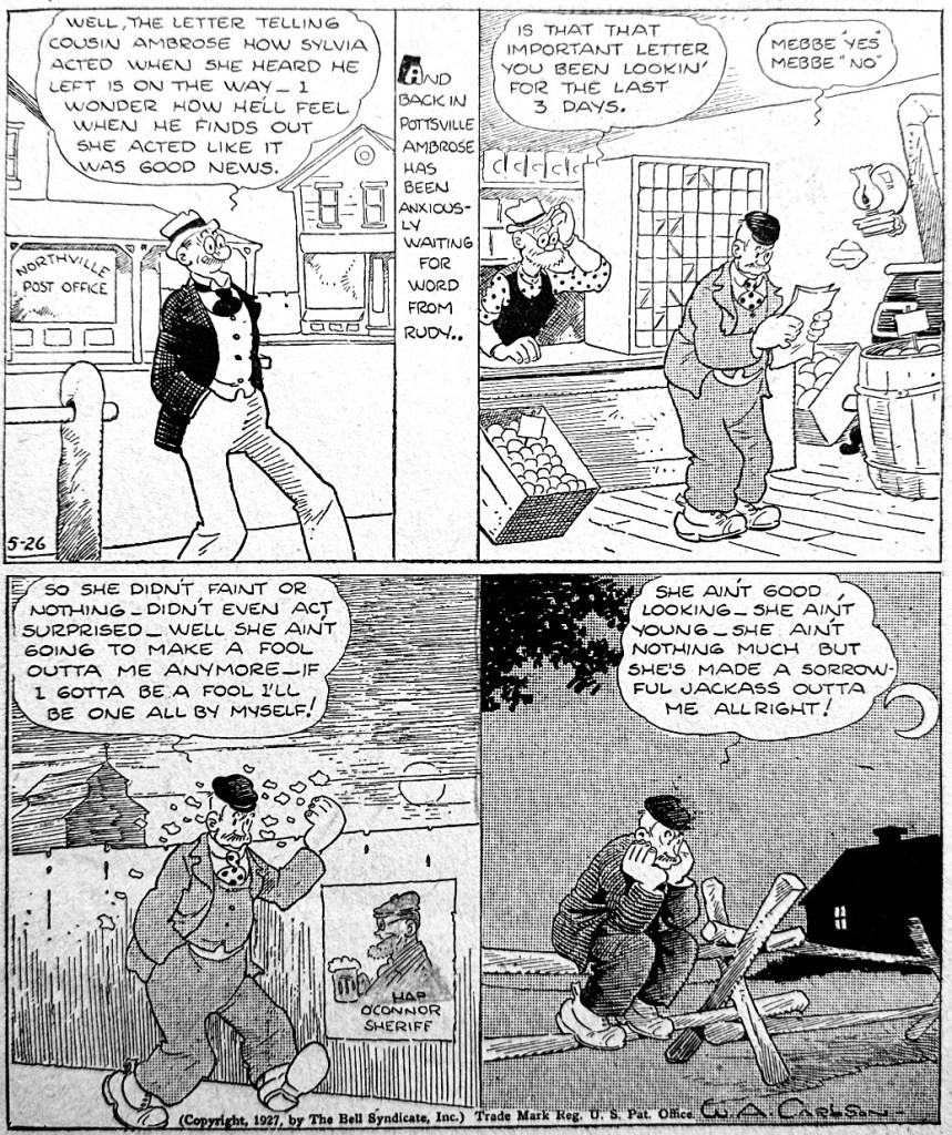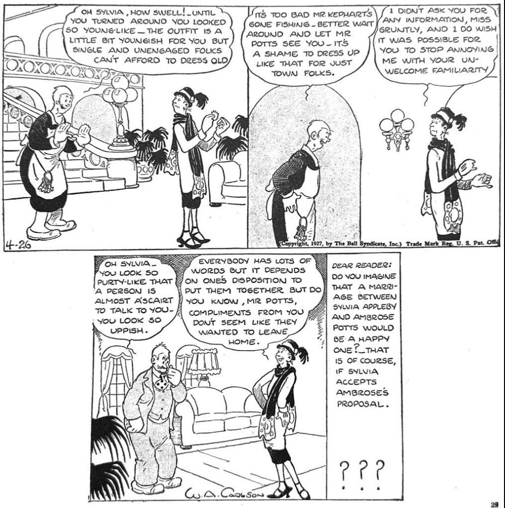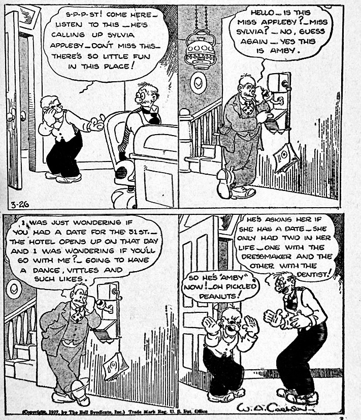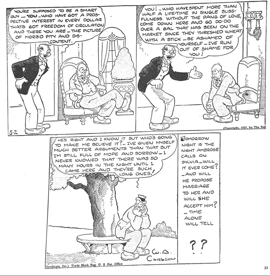 Hess wrote gags for Sidney Smith’s The Gumps and well understood the conventions of emerging situation comedy. And while in name and domestic situation, The Nebbs clearly mimicked some aspects of The Gumps, Hess’s variations were notable. Rudy Nebb is less bombastic than Andy Gump. And the thrust of the strip is more wordy and introspective. It seemed to have as much in common with the internal monologues of Harold Gray’s Little Orphan Annie and the slice of life motif of Frank King’s Gasoline Alley. Most of the available samples of The Nebbs focus on the Sunday standalone gag strips. For a richer sense of the continuity of Hess and Carlson’s world, I have to rely on a contemporaneous 1928 Cupples and Leon reprint. Alas, the selection in this volume focuses outside of the the Nebbs themselves and on the wealthy cousin Ambrose and his dual failure at launching a local hotel and courting the spinster Sylvia.